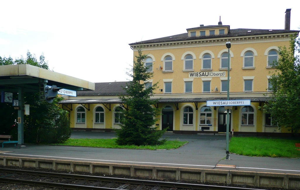 Beeindruckend ist das große Empfangsgebäude von Wiesau. Es zeugt von der Bedeutung, die der Bahnhof bis in die 1980er Jahre mit den zwei Nebenbahnen nach Tirschenreuth und Waldsassen hatte. Interessant auch das Vorsignal am Bahnsteigdach. (6.7.11) Jörg Schäfer