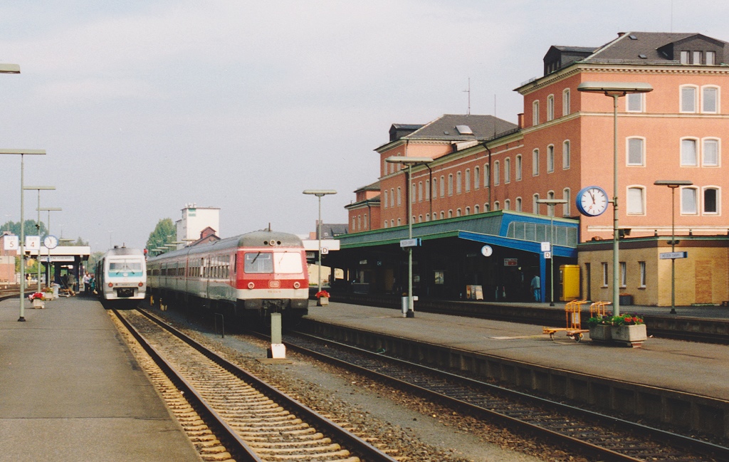 Um die Jahrtausendwende herrschten in Weiden noch alte Farben vor: Ein mintgrün-weißer VT 610 auf Gleis 4, 614 054 in Popfarben auf Gleis 1 und das Empfangsgebäude rot-orange. Jörg Schäfer