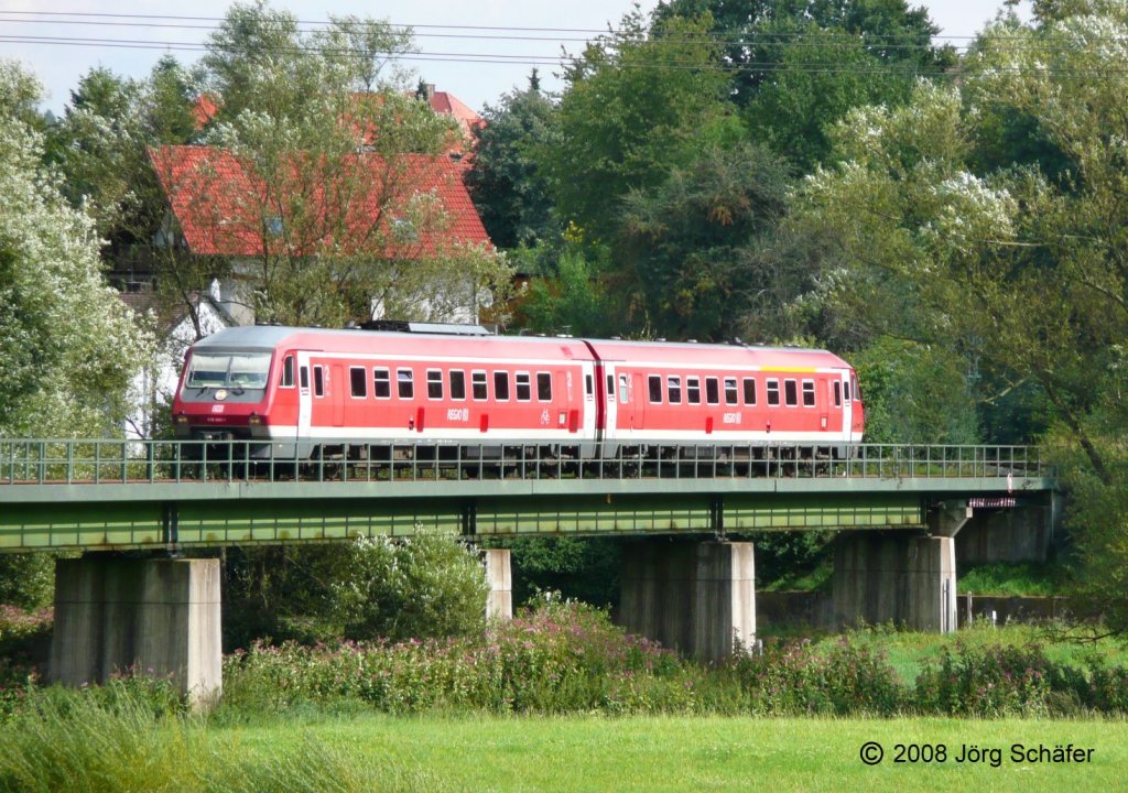 610 008 als RE aus Nürnberg am 18.8.08 etwa 5 km südlich von Weiden. Bis Ullersricht verlaufen die eingleisige Strecke nach Nürnberg und die zweigleisige Strecke nach Regensburg parallel zueinander. Im Hintergrund sieht man, wo sie sich trennen. Jörg Schäfer