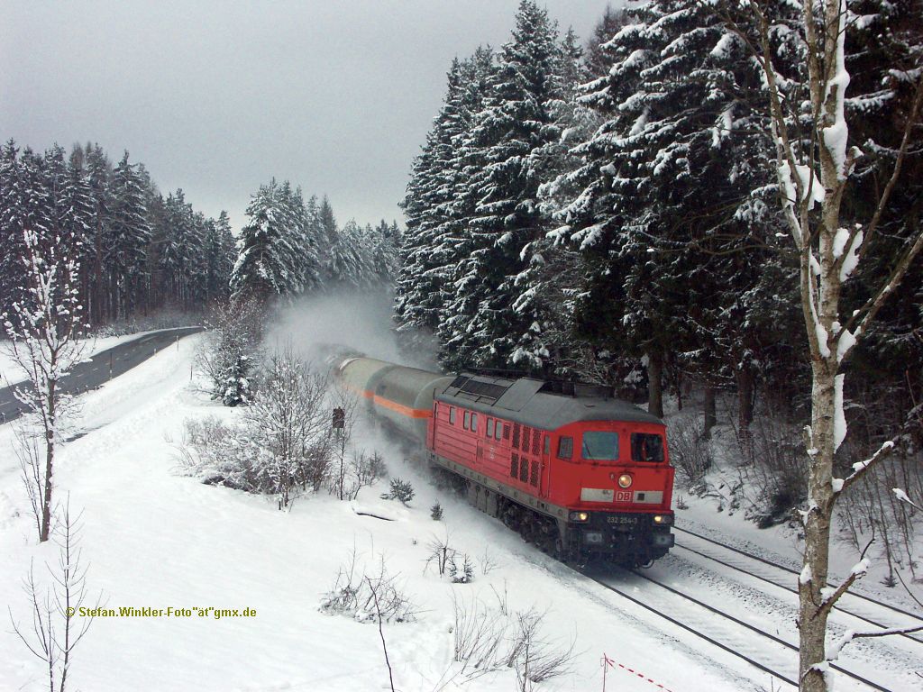 Fotografenglück: Unerwartet kam am Mittag des 27.01.2011 dieser Güterzug bei Martinlamitz aus dem winterlichen Wald gerauscht. Zuglok ist 232 354. Ober franke