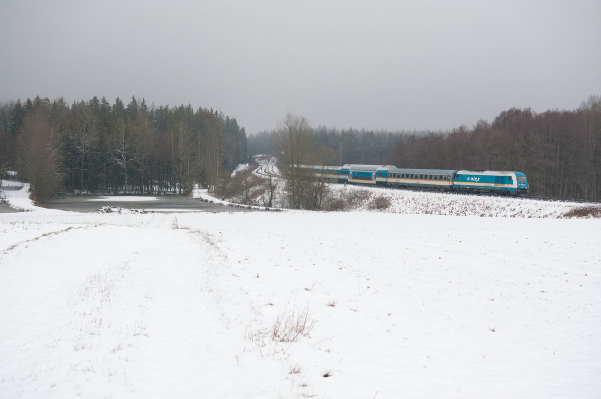 Bei leichten Schneefall und kurz vor Sonnenuntergang zeigte sich der ALX 84109 von München Hbf nach Hof Hbf bei Oberteich, 02.01.2019 Korbinian Eckert