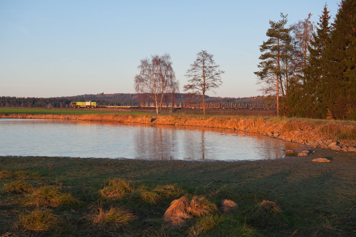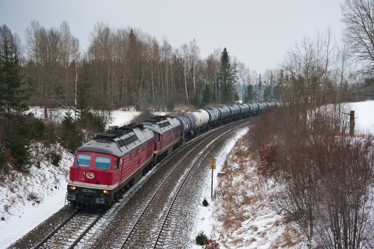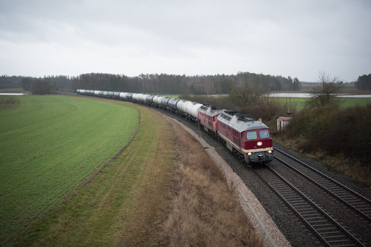 Bei absoluten *-Wetter konnte der LEG-Kesselzug von Vohburg nach Bitterfeld bei Oberteich abgelichtet werden. Gezogen wurde der Zug einen Tag vor Weihnachten von 132 158 und 232 416. (23.12,2018) Korbinian Eckert
