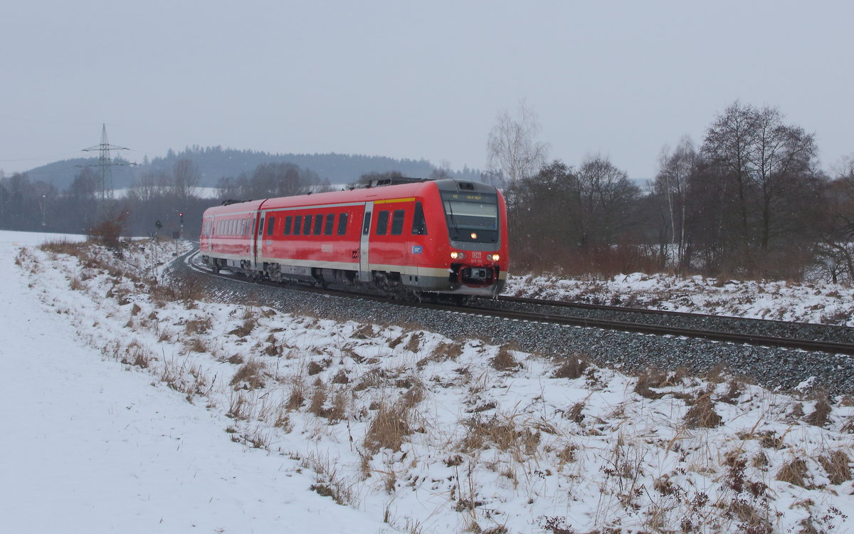 Beginnender Schneefall bei Dölau kurz vor Hof am 01.2.2019 als der Regioswinger 612 155 den Fotostandort passierte.