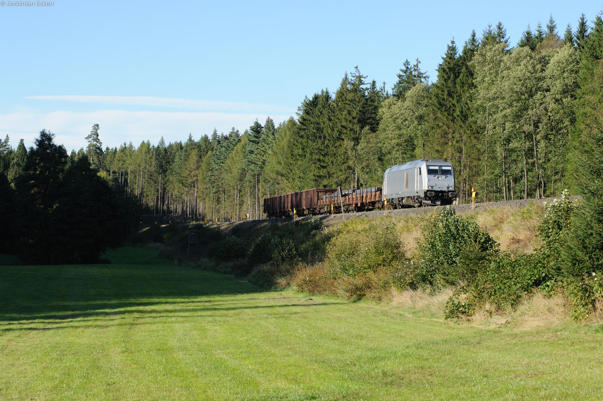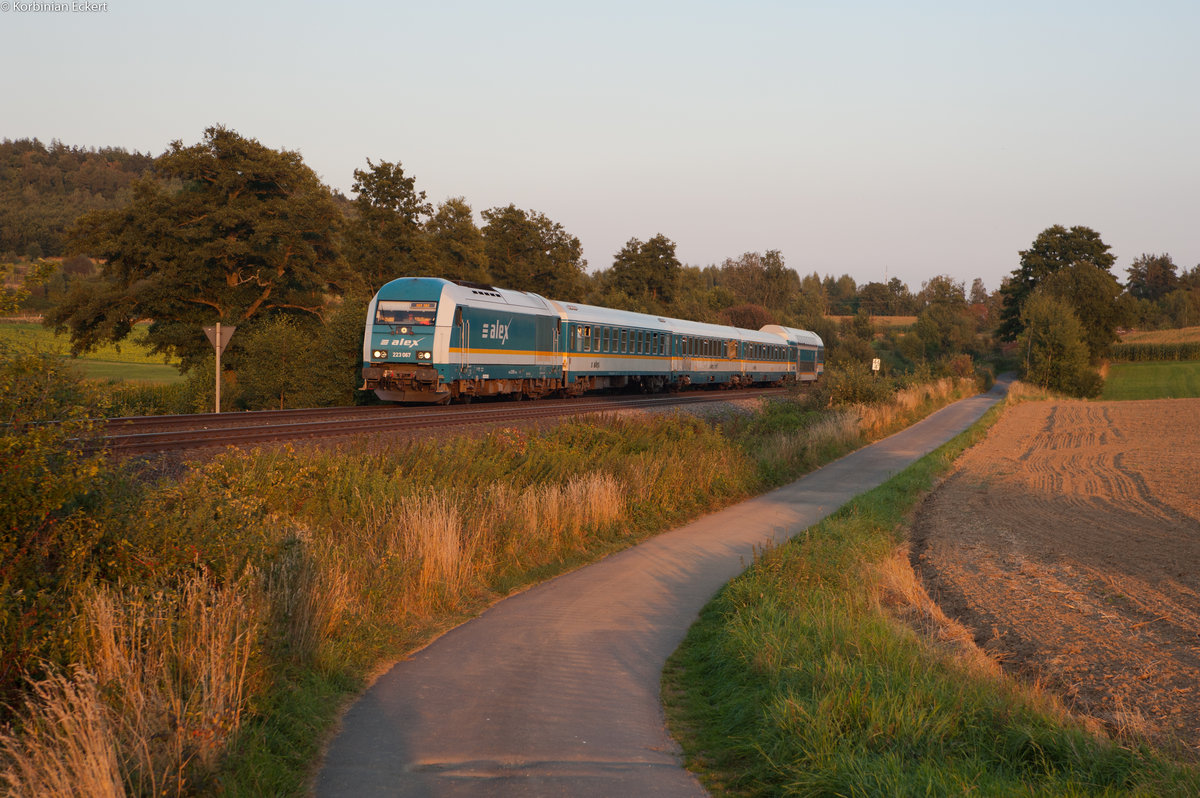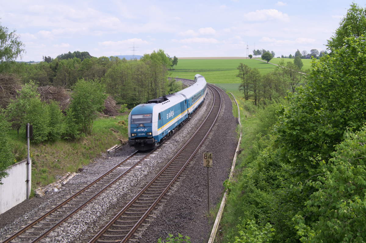Bergab aus dem Fichtelgebirge ins Tal der Saale. 223 070 mit Alex München - Hof rollt hinab ins Tal der Saale. Der Alex überquert hier gerade das Flüßchen Lamitz, das nach einigen hundert Metern in die (sächsische) Saale mündet. Bahnstrecke 5050 Weiden - Oberkotzau am 23.05.2017 Ivonne Pitzius