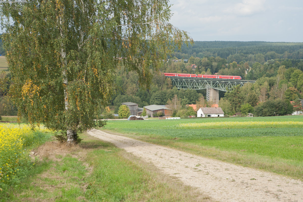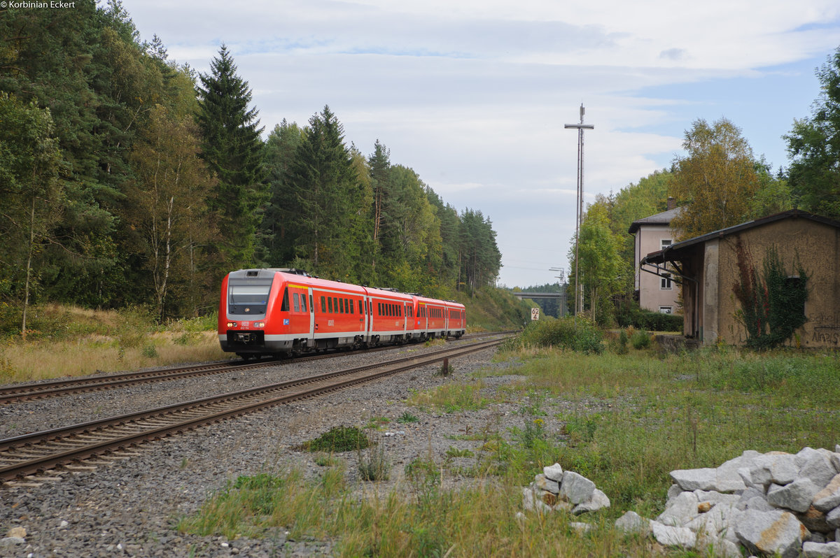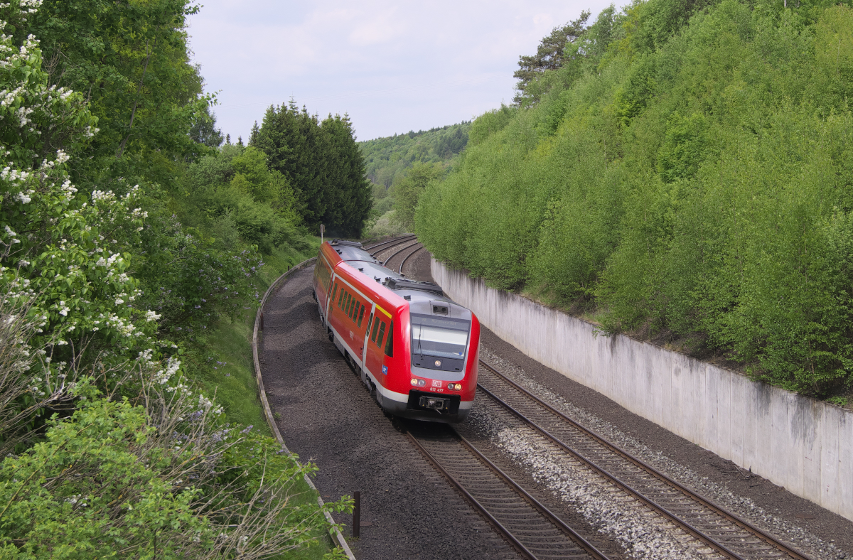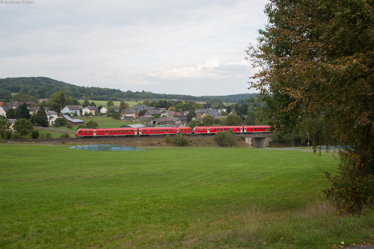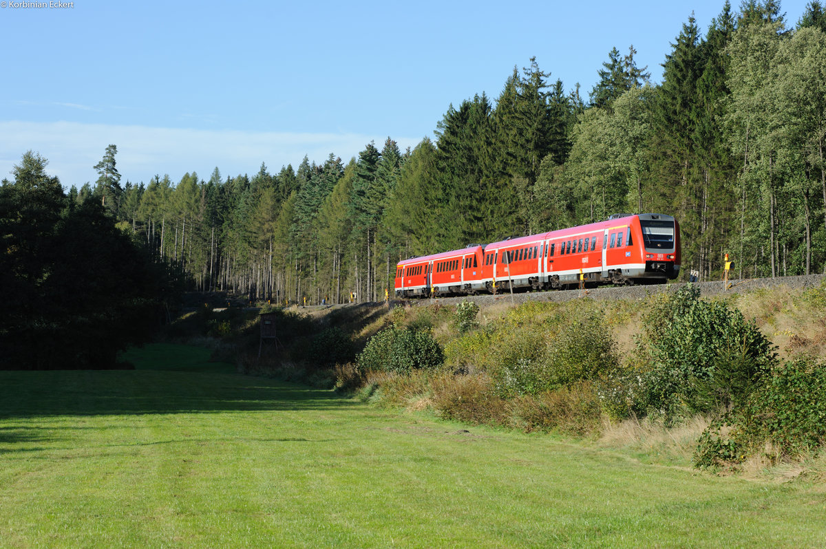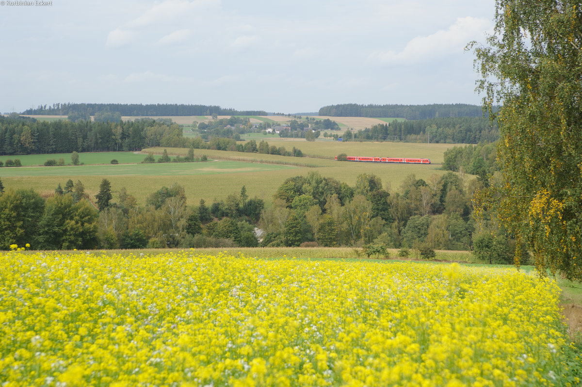 612 477 ist als RE Hof - Nürnberg unterwegs und erklimmt bei Fattigau nun die Höhen des Fichtelgebirges. Oberkotzau liegt bei 485 Meter Höhe und der höchste Punkt wird bei Röslau mit 585 Metern erreicht werden. Bahnstrecke 5050 Weiden - Oberkotzau am 23.05.2017 Ivonne Pitzius