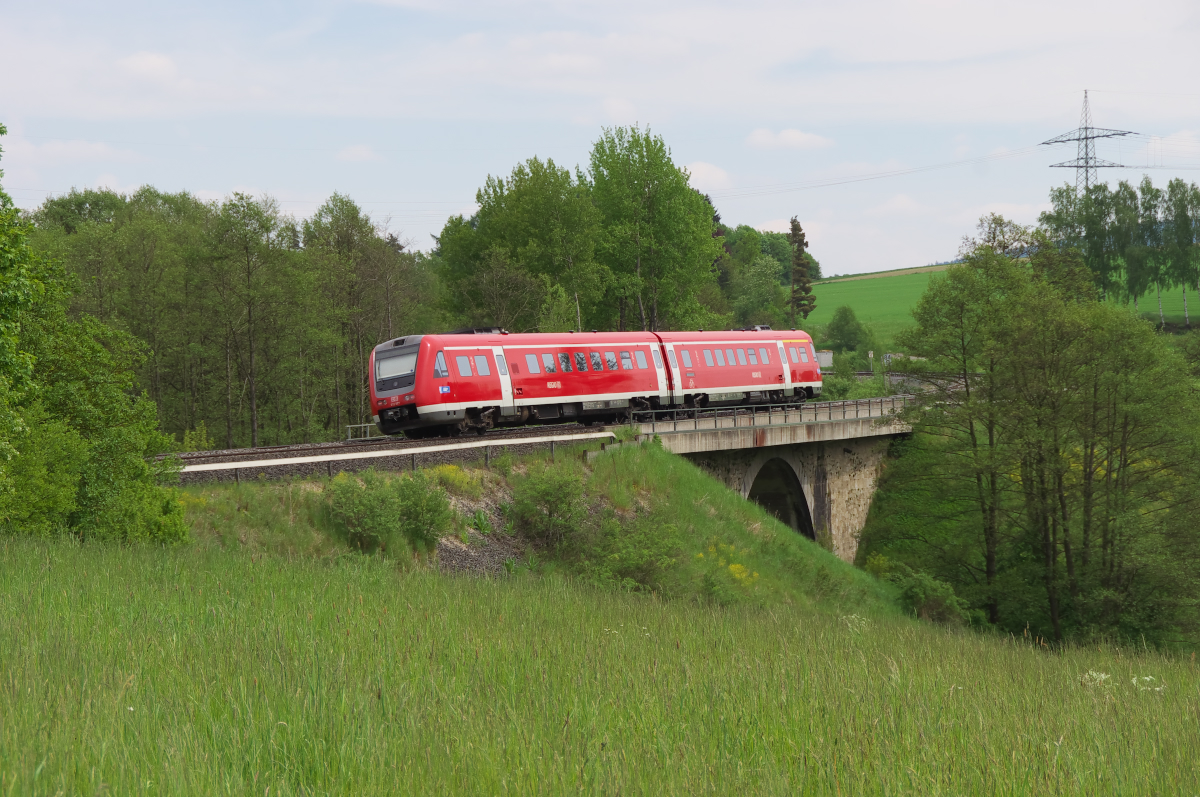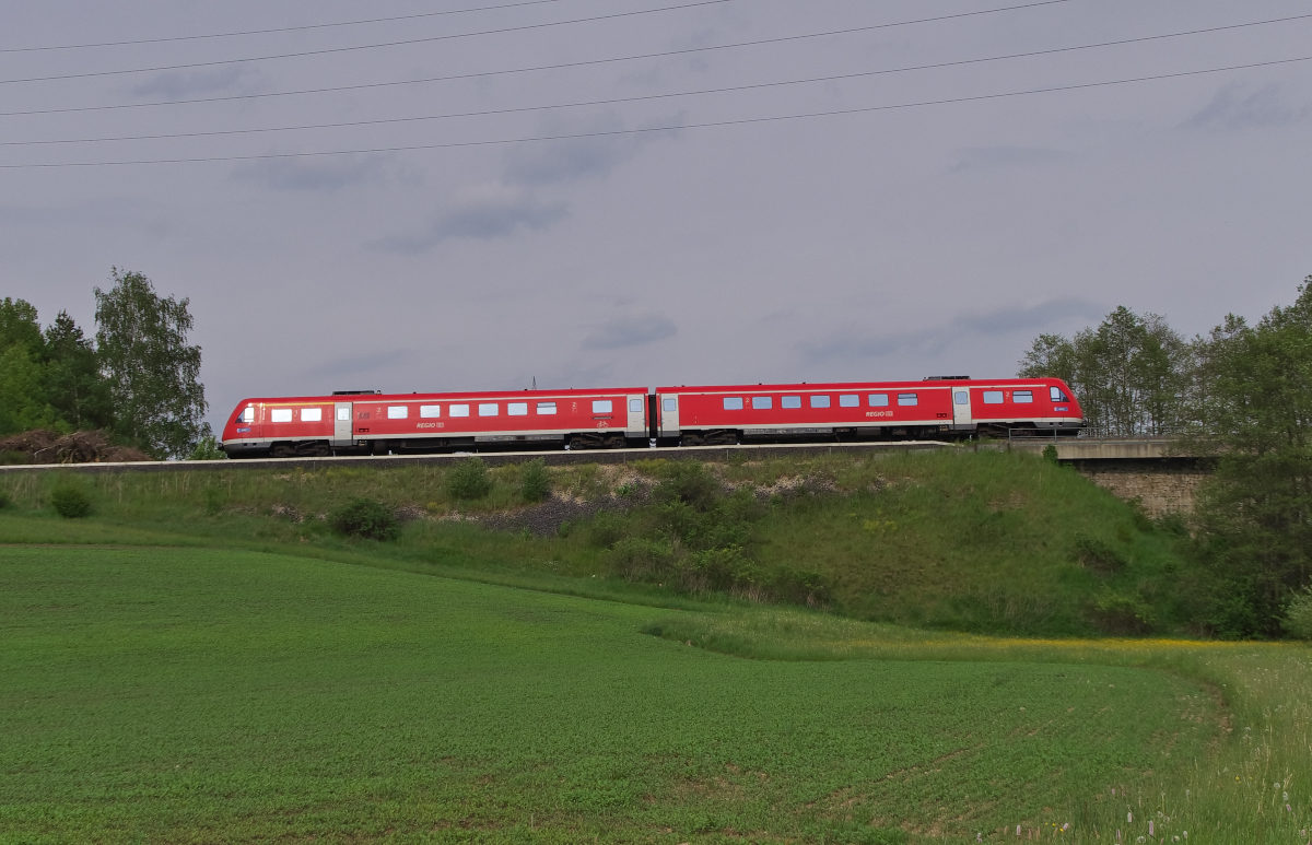 612 477 ist als RE Hof - Nürnberg unterwegs und erklimmt bei Fattigau nun die Höhen des Fichtelgebirges. Oberkotzau liegt bei 485 Meter Höhe und der höchste Punkt wird bei Röslau mit 585 Metern erreicht werden. Bahnstrecke 5050 Weiden - Oberkotzau am 23.05.2017 Erhard Pitzius