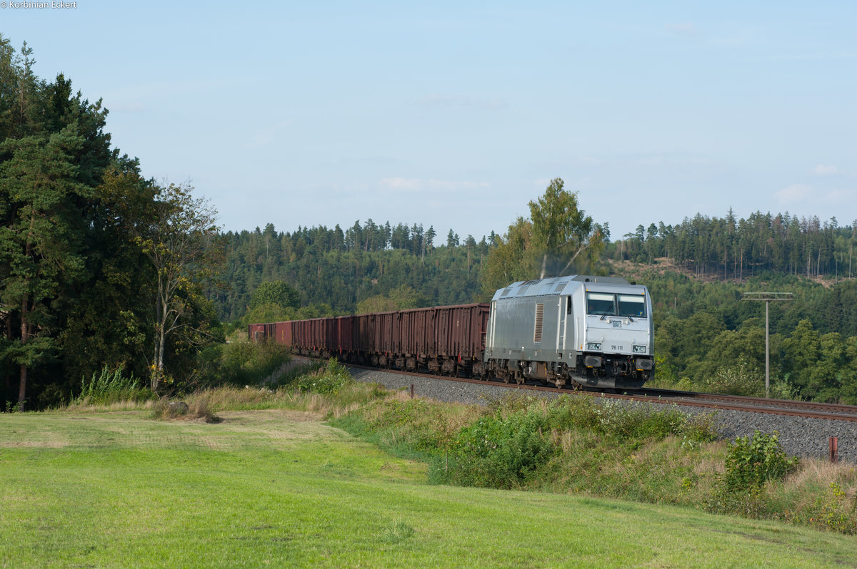 Vom Fichtelgebirge rollt der Zug nun hinab ins Tal der sächsischen Saale und hat hier gerade das Flüsschen Lamitz überquert. Bahnstrecke 5050 Weiden - Oberkotzau (bei Hof) am 23.05.2017 bei Fattigau. Ivonne Pitzius