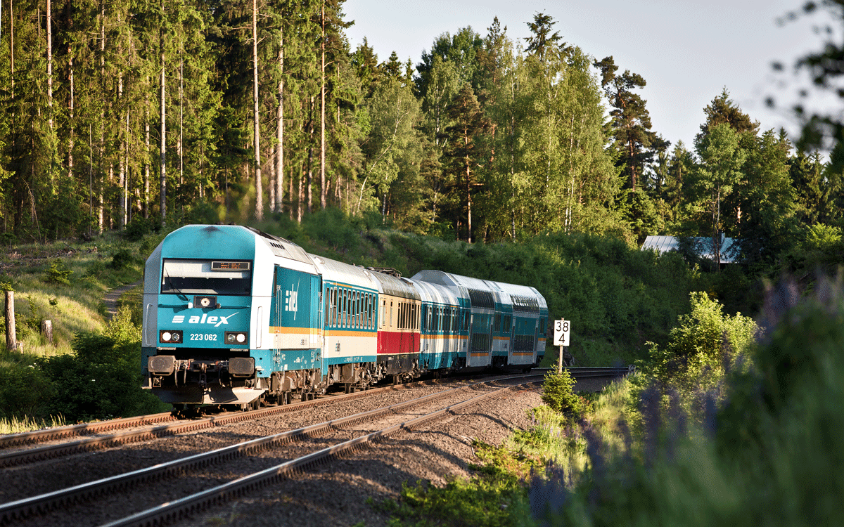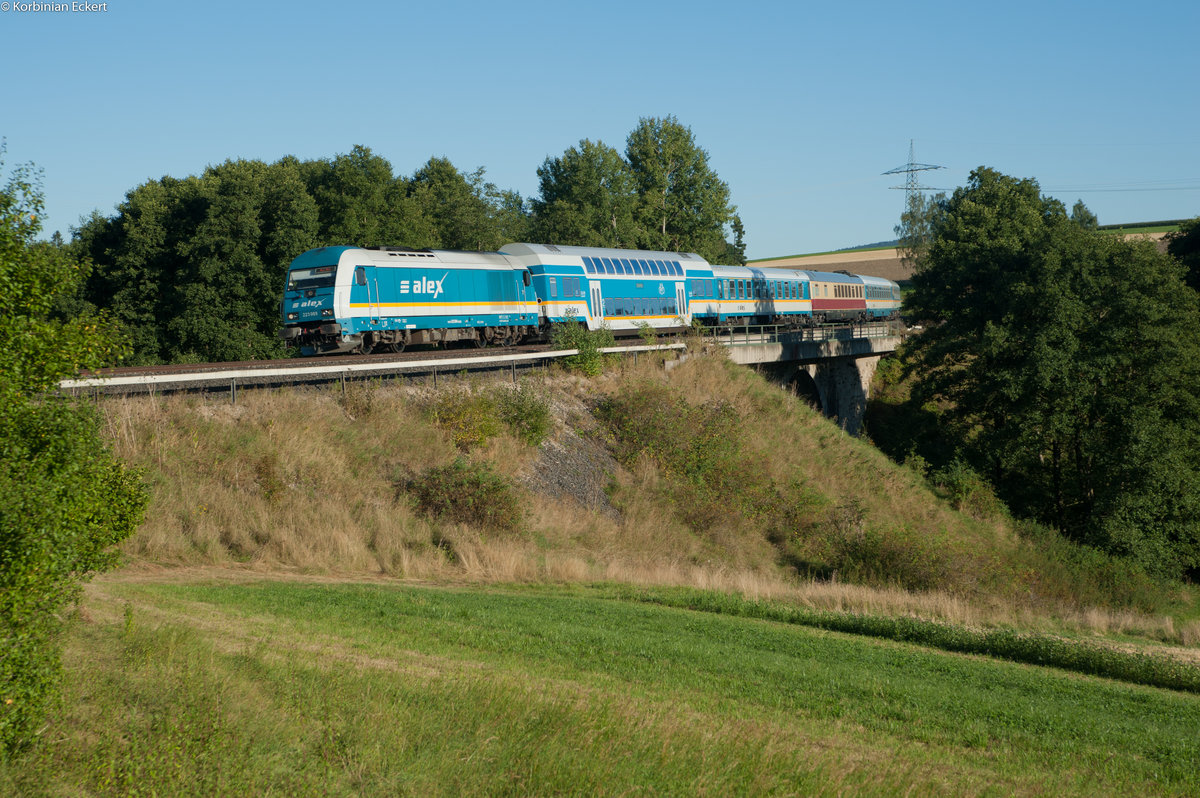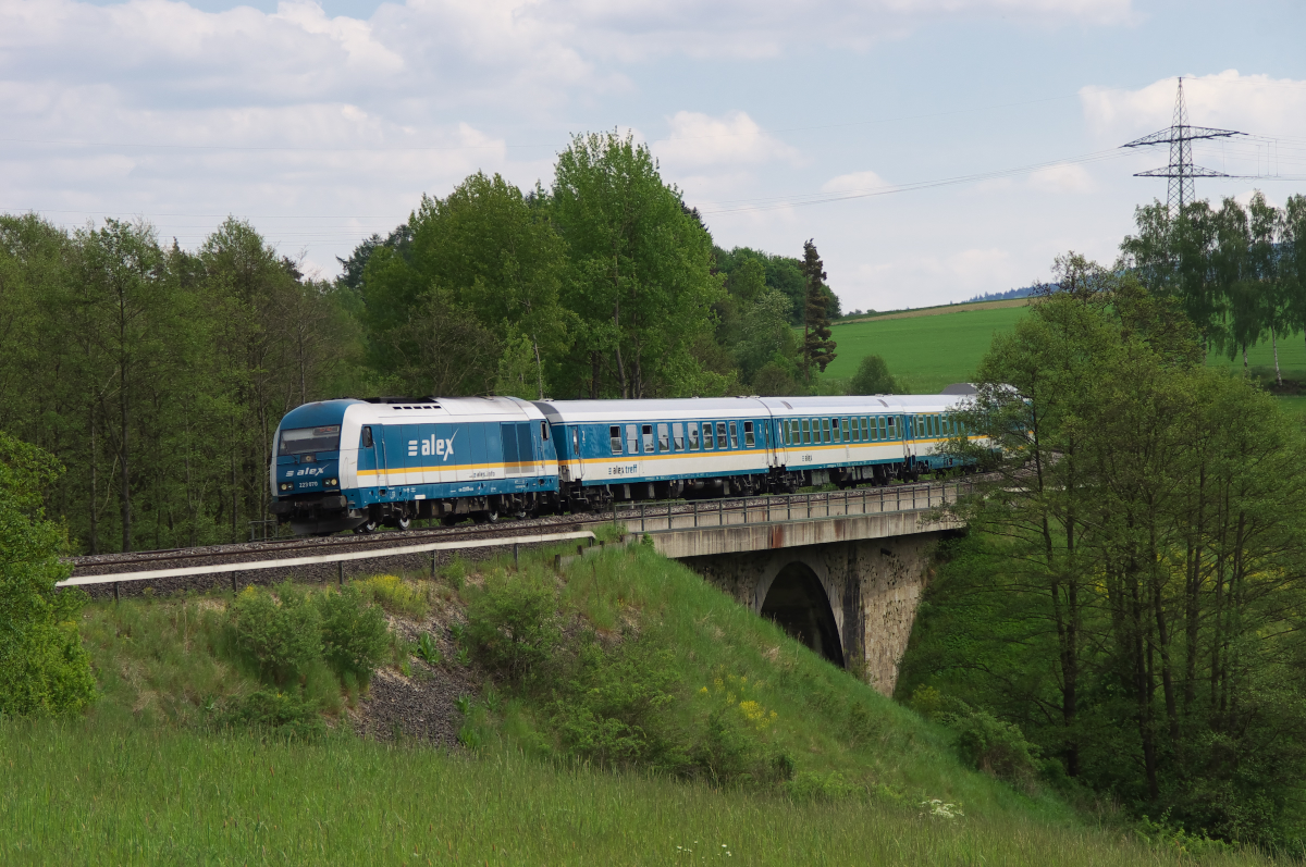 Bergab aus dem Fichtelgebirge ins Tal der Saale. 223 070 mit Alex München - Hof rollt hinab ins Tal der Saale. Bei Fattigau hat man von einem Standort den Blick auf zwei Bahnstrecken, Bamberg - Hof und Weiden - Oberkotzau. Zwischen Fattigau und Oberkotzau laufen die Strecken parallel, um sich dann in Oberkotzau zu vereinen. Der Alex überquert hier gerade das Flüßchen Lamitz, das nach einigen hundert Metern in die (sächsische) Saale mündet. Bahnstrecke 5050 Weiden - Oberkotzau am 23.05.2017 Erhard Pitzius