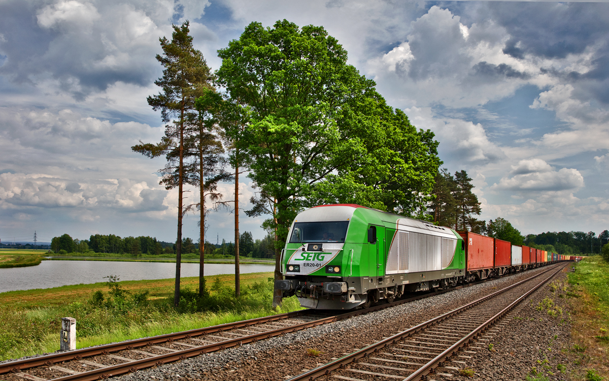 Die SETG Diesellokomotive Er 20-01 fährt bei einem herannahenden Gewitter in Oberteich mit dem Containerzug aus Wiesau vorüber.Bild vom 3.6.2017 Matti Morelli