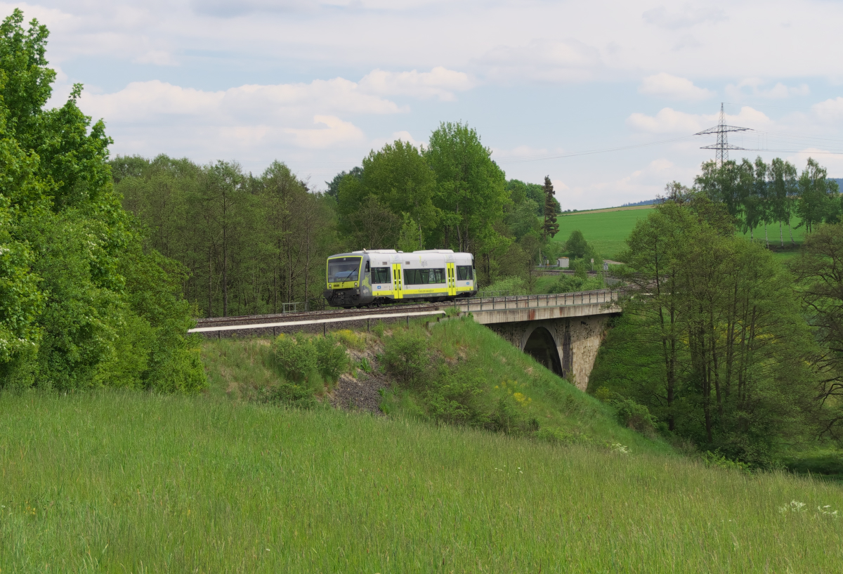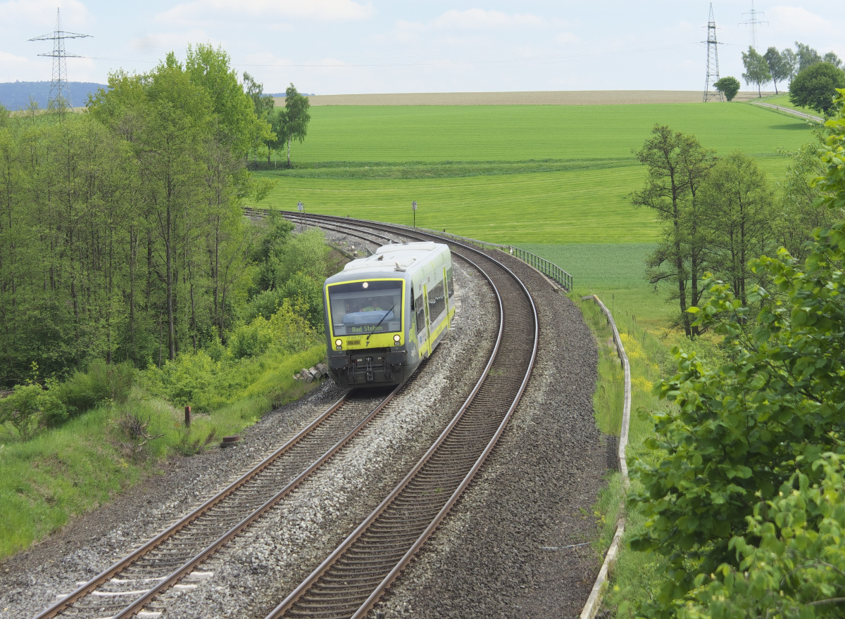 Einen interessanten Laufweg hat dieser Agilis Regioshuttle. VT 650.737 ist zwischen Marktredwitz und Bad Steben unterwegs. Hof Hbf. liegt als Bahnknoten fast in der Mitte der Relation. Bahnstrecke 5050 Weiden - Oberkotzau bei Fattigau am 23.05.2017 Erhard Pitzius
