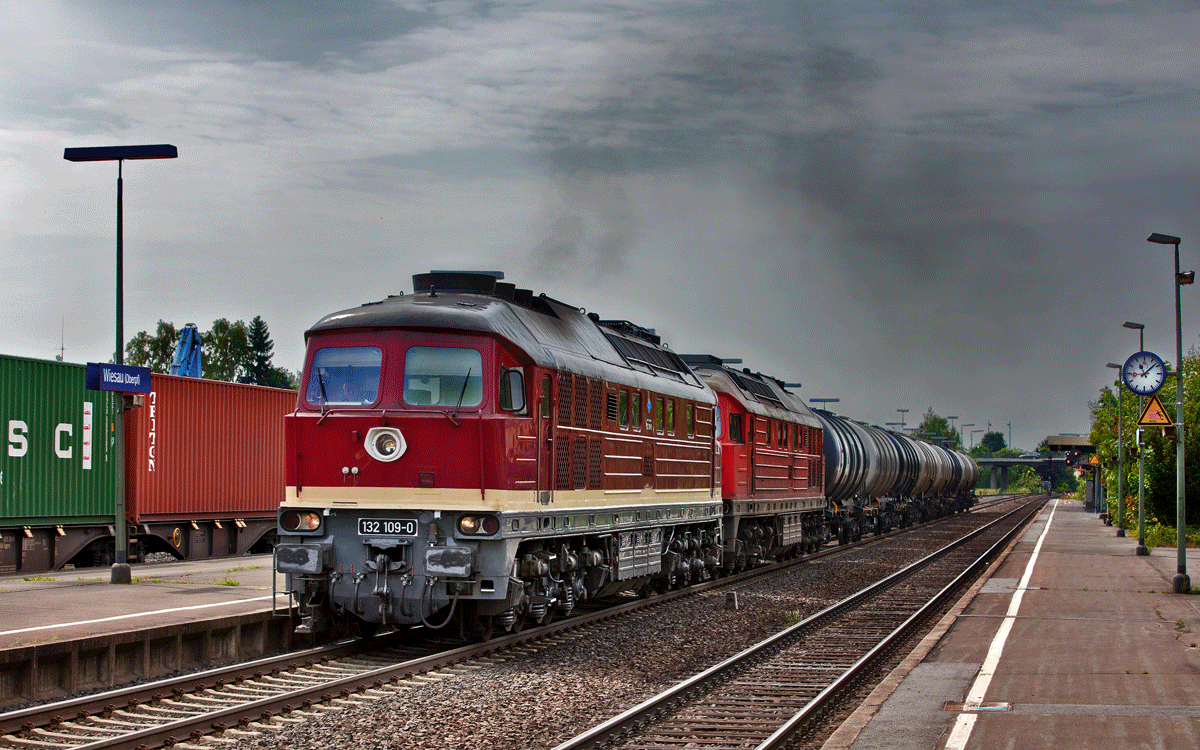 Im vollen Gegenlicht donnert eine Doppeltraktion bestehend aus den Diesellokomotiven LEG 132 109-0 / 232 239-4 mit einem Kesselwagenzug und einer herrlichen Abgaswolke durch den Bahnhof von Wiesau.Bild vom 2.6.2017 Matti Morelli