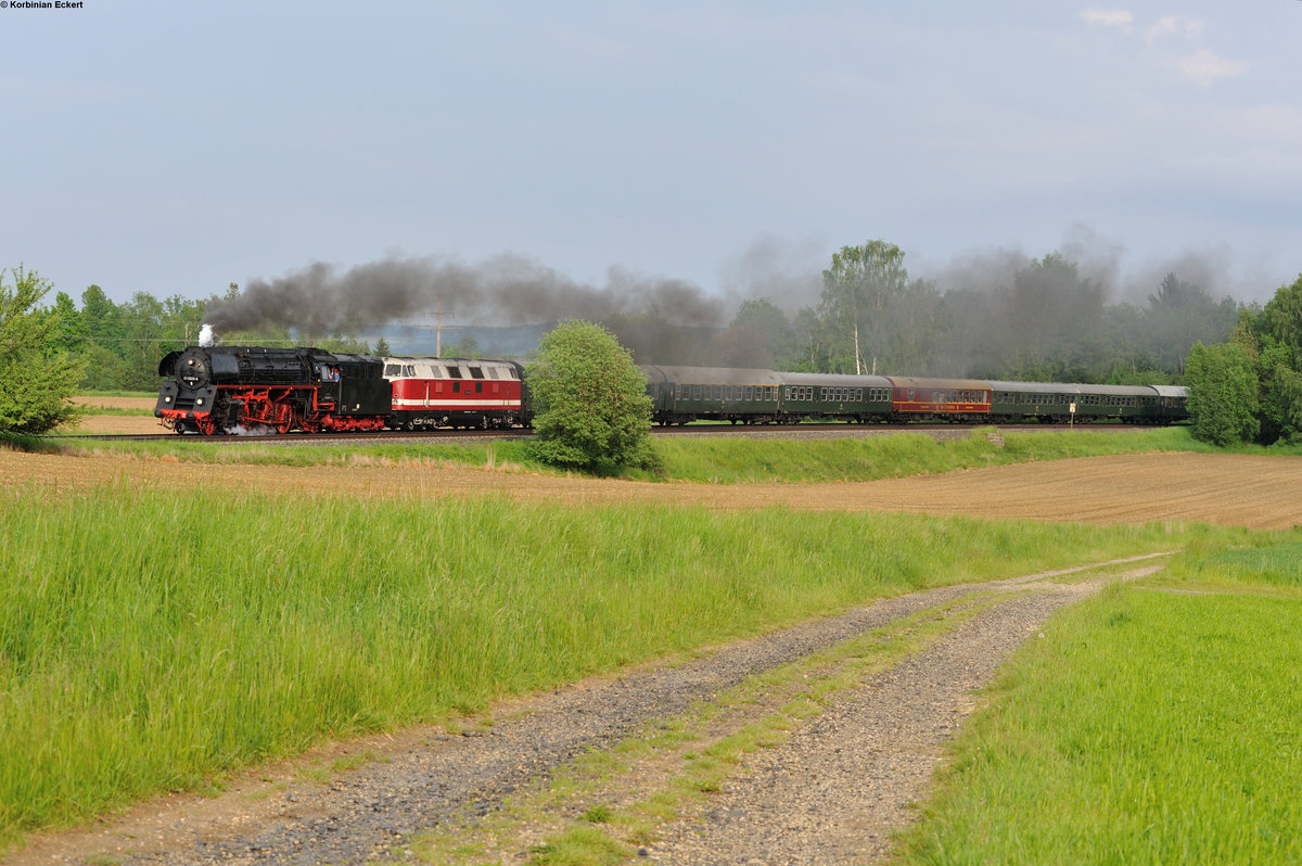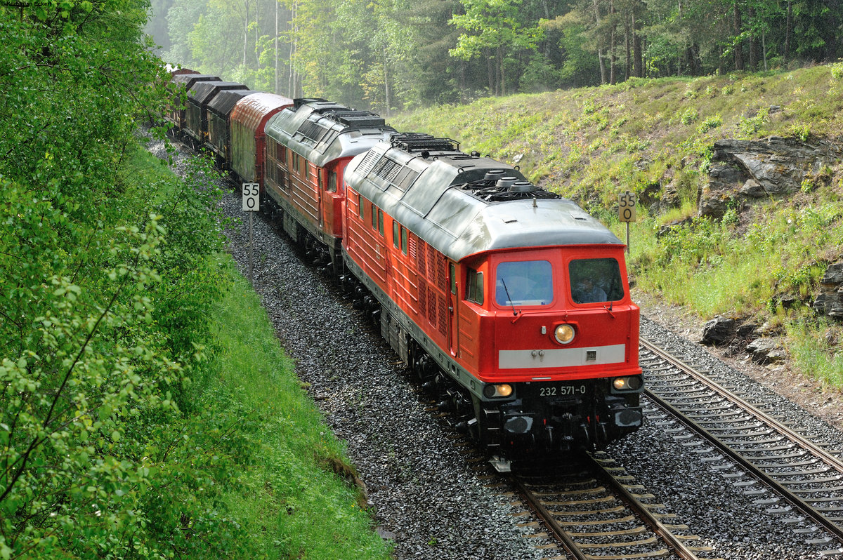 Überraschend aus der Gegenrichtung bei Thölau tauchte plötzlich 232 571 mit einer Schwestermaschine und dem EZ 51082 von Hof Richtung Nürnberg auf, 28.05.2016 Korbinian Eckert