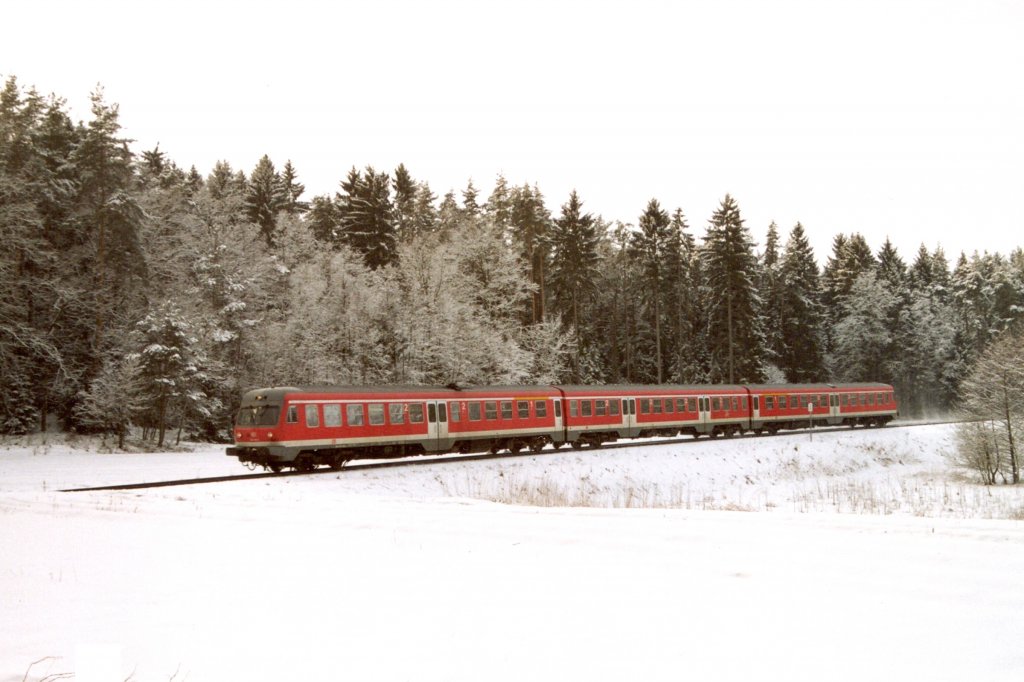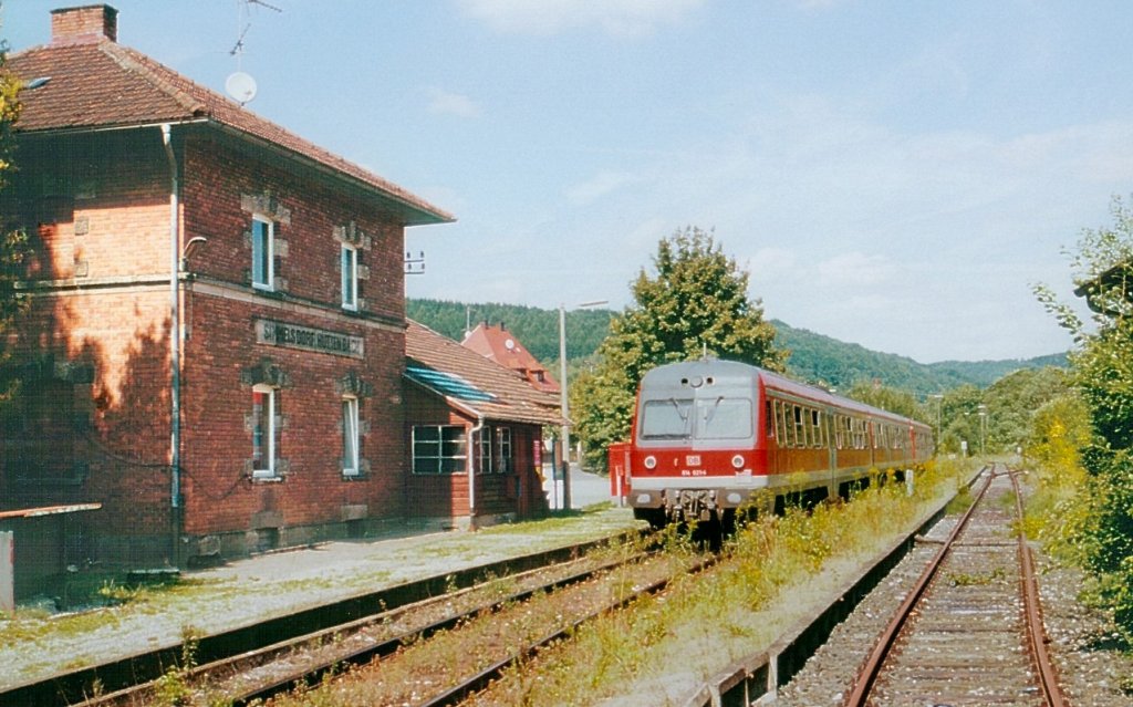 Blick nach Norden auf den Endbahnhof Simmelsdorf-Hüttenbach. 614 021 wartet am 11.8.00 auf die Abfahrtszeit für die Rückfahrt nach Neunkirchen am Sand. Jörg Schäfer