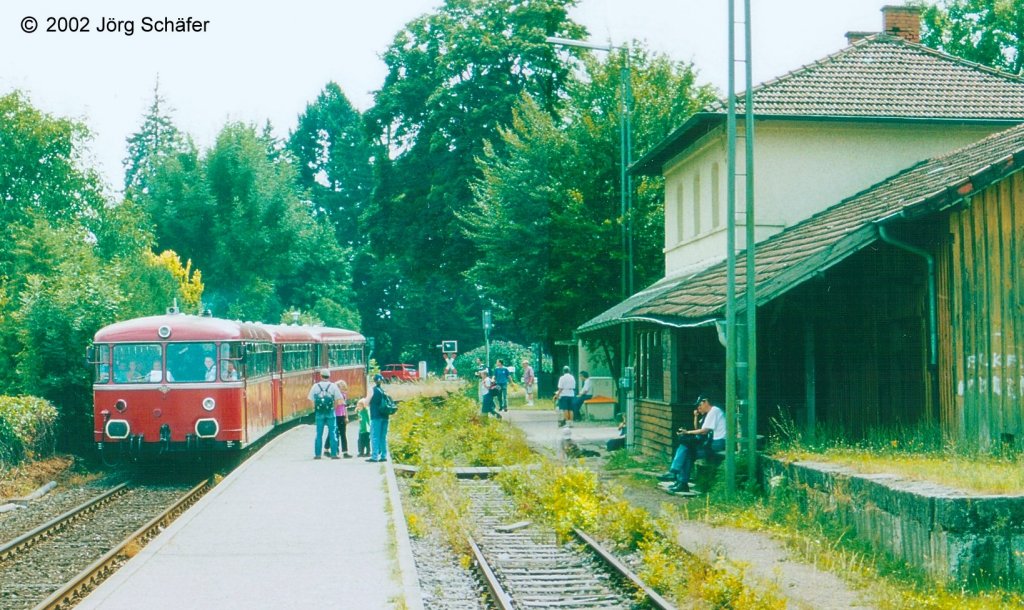 Bis Juni 1996 kreuzten in Schnaittach noch regelmäßig Züge. Danach wurde Gleis 1 nicht mehr gebraucht, die Schnaittachtalbahnfreunde konnten den Abbau aber fast 10 Jahre lang verhindern. Das Kreuzungsgleis wurde dann zwar abgebaut und die Trasse verfüllt, sie wird aber als Option für eine Fahrplanverdichtung nicht bebaut. (Blick Richtung Süden am 13.7.02)