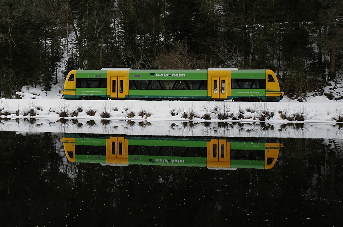 Bei einem Besuch der Waldbahnstrecke von Gotteszell nach Viechtach darf natürlich eine Aufnahme der Spiegelung am aufgestauten Schwarzen Regen bei Gumpenried nicht fehlen. Hier brummt 650 070 am 14.02.2019 in Richtung Teisnach.