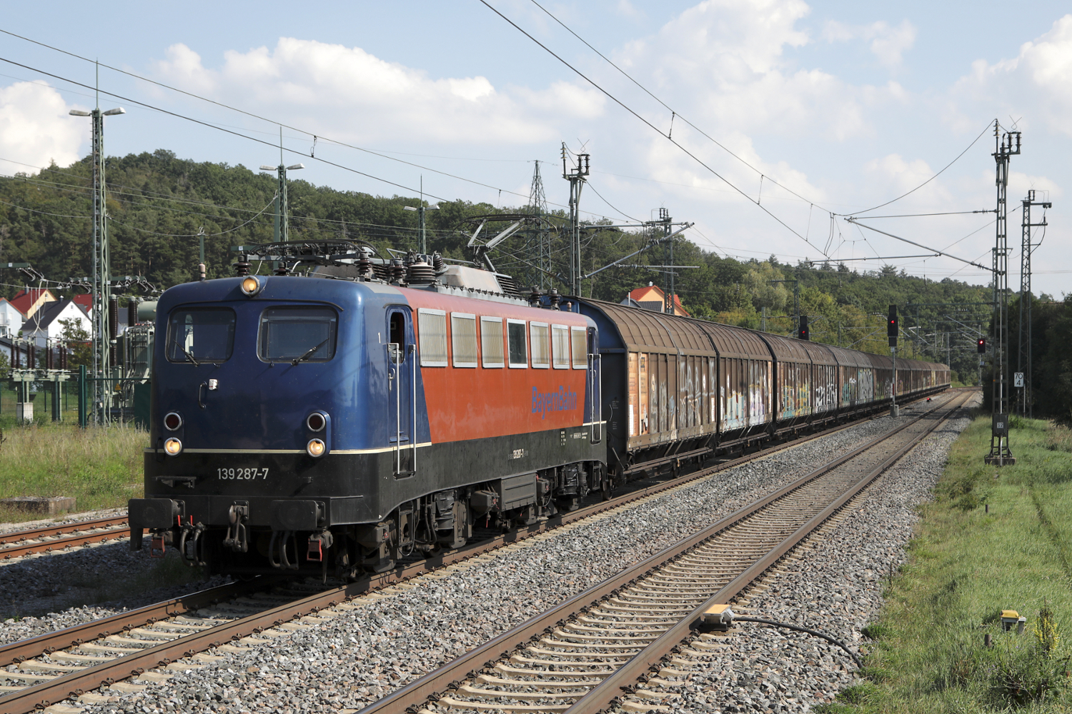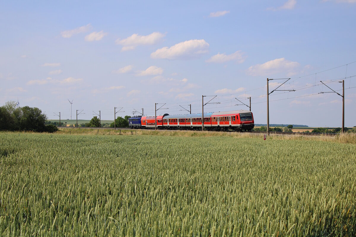 Von Ende Juni 2023 bis September 2024 gab es auf der Linie RE80 zwischen Treuchtlingen und Würzburg einen interessanten Ersatzverkehr zu beobachten. Aufgrund von Fahrzeug- und Personalmangel musste Go-Ahead Bayern (bzw. nach der Übernahme ARVERIO) das Unternehmen Wedler Franz Logistik beauftragen, einen Teil der Leistungen auf dieser Strecke mit dessen eigenen Fahrzeugen zu erbringen. Für Eisenbahnfreunde war das höchst interessant, wurden dabei insbesondere ehemalige Fahrzeuge der Deutschen Reichsbahn verwendet. Die wieder in den Auslieferungszustand mit orientroter Lackierung versetzte 112 024 beschleunigte am 07. September 2024 den aus drei Doppelstockwagen Görlitzer Produktion gebildeten RE 55836 bei Wettelsheim kurz hinter dem Bahnhof Treuchtlingen in Richtung des nächsten Halts Gunzenhausen. Christoph Schneider