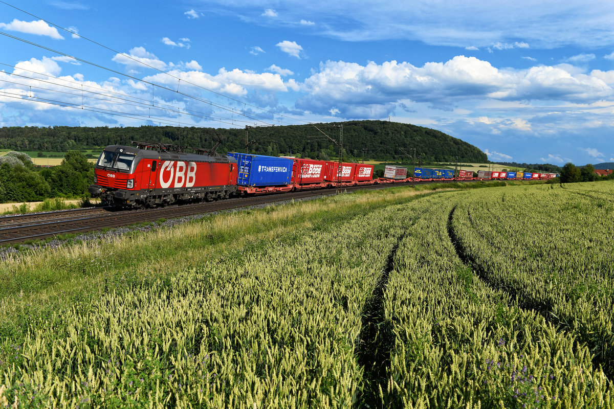 Am 01. Juli 2020 beförderte der ÖBB Vectron 1293.014 den KLV-Zug DGS 42176 über seinen gesamten Laufweg von Verona Q. E. nach Lübeck Dänischburg Gbf. Bei Wettelsheim in Mittelfranken konnte ich die Leistung vor einer aufziehenden Gewitterfront aufnehmen. Christoph Schneider