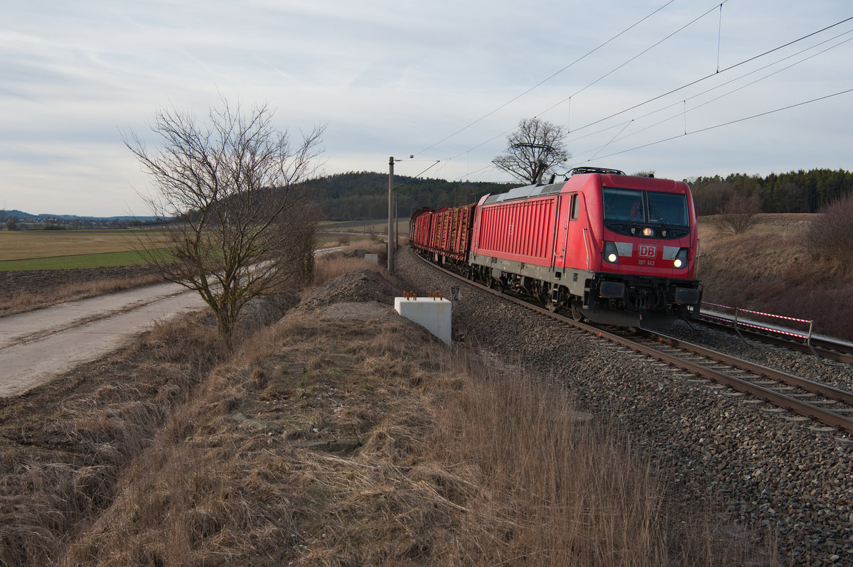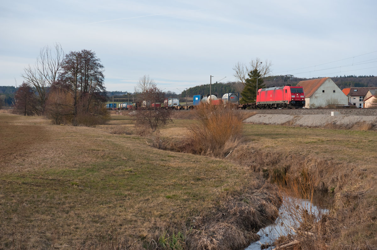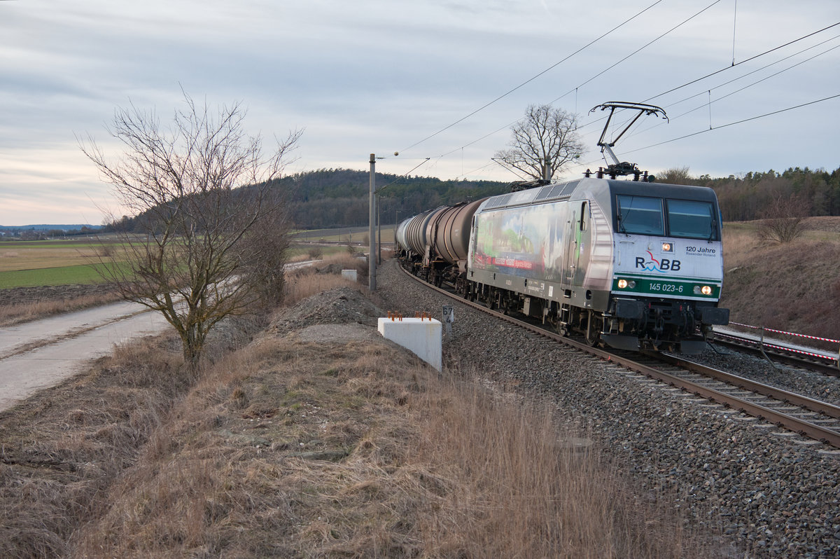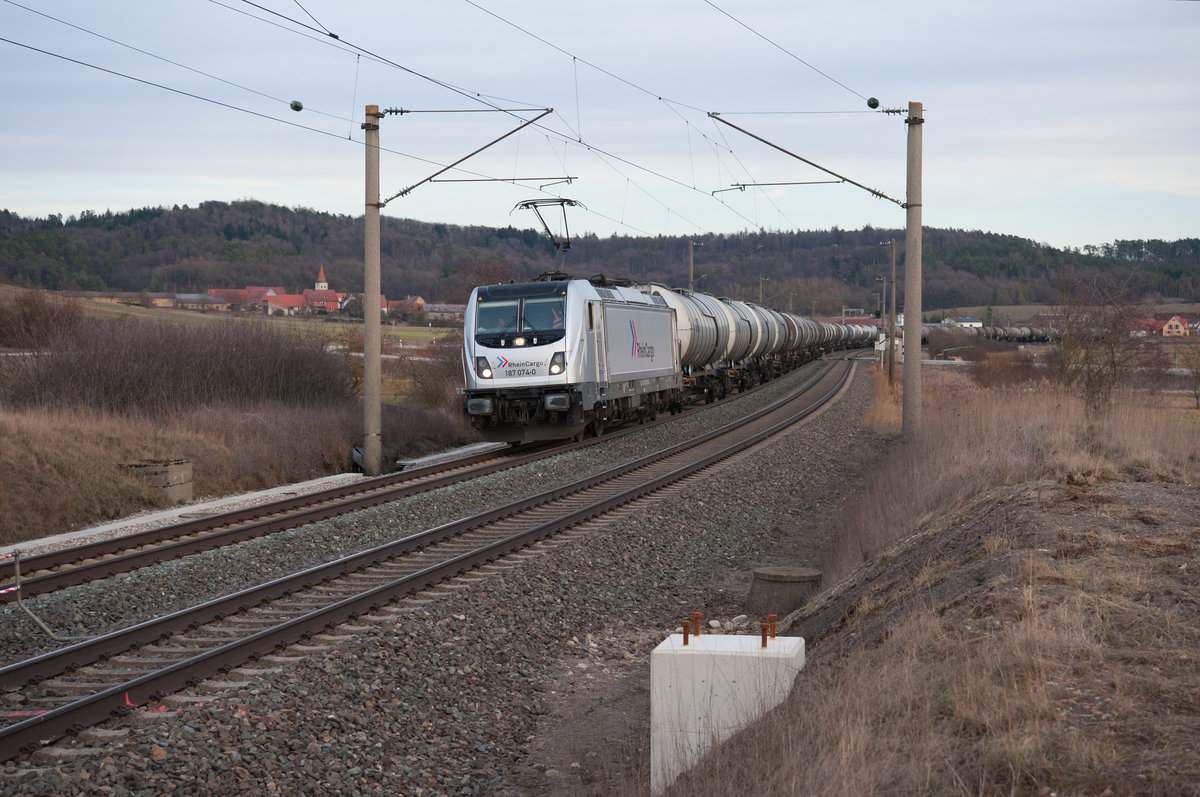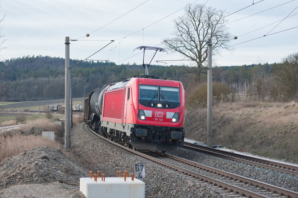 187 074 von Rhein Cargo mit einem Kesselwagenzug bei Mitteldachstetten Richtung Würzburg, 23.02.2019
