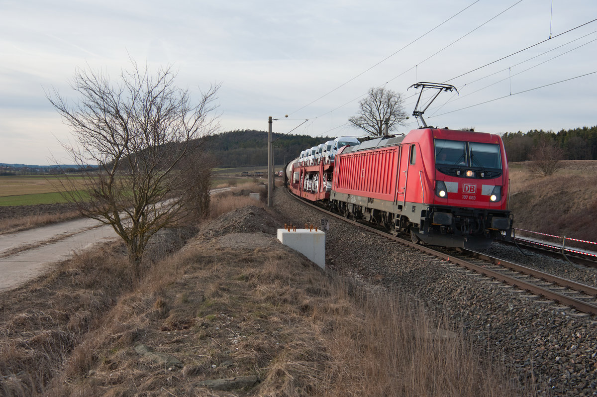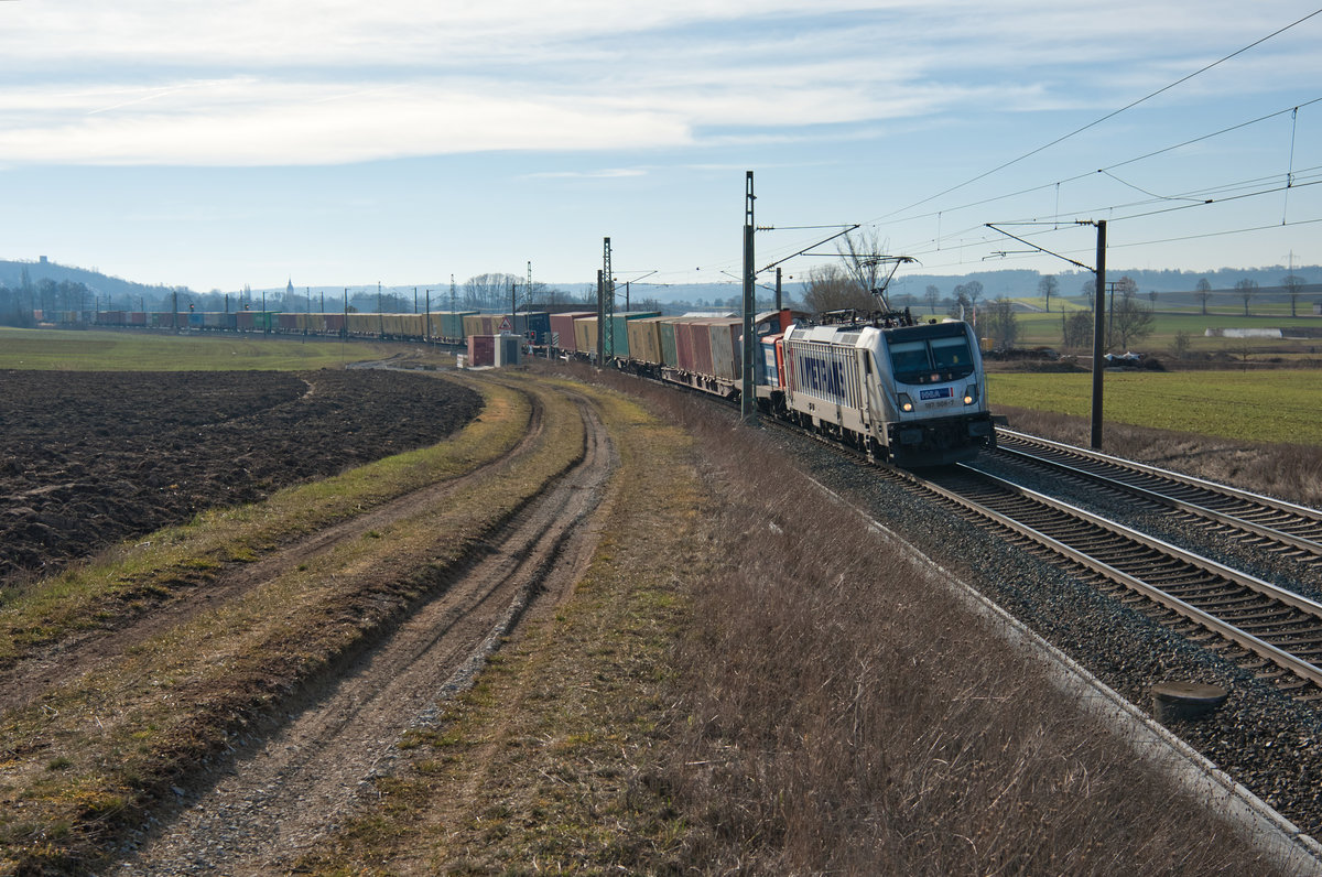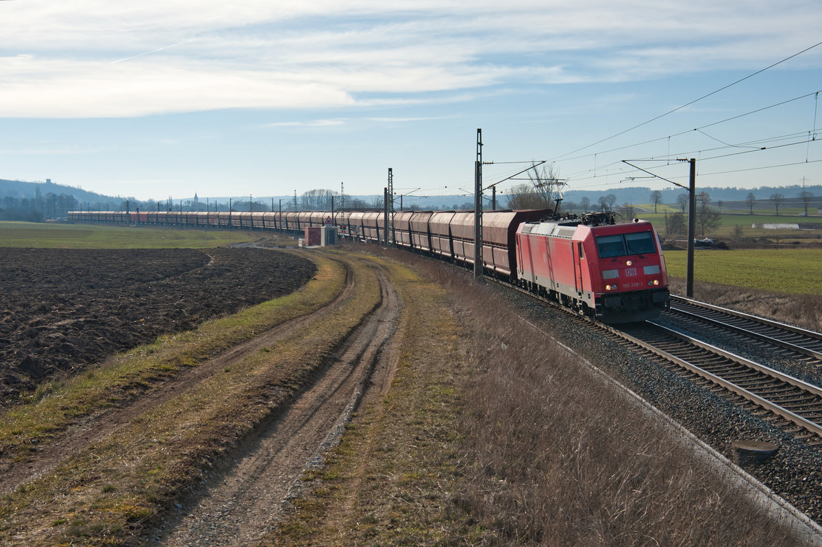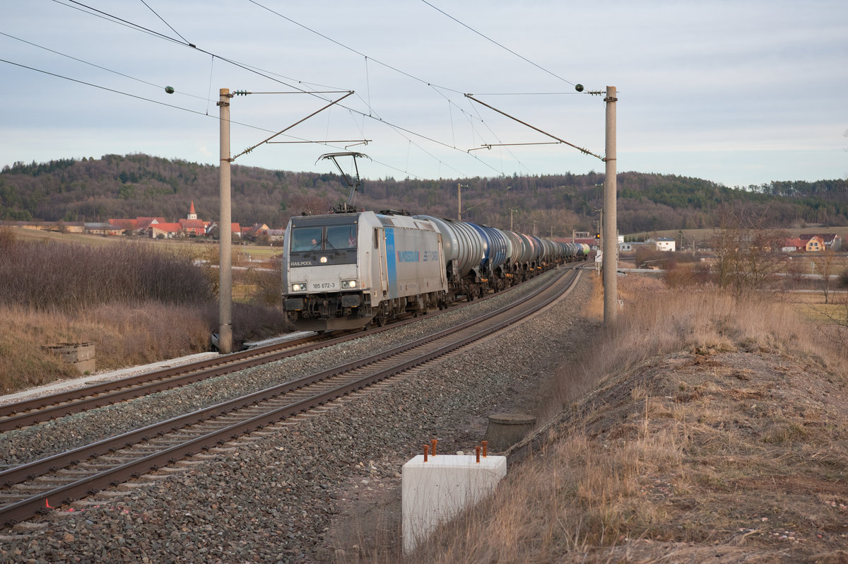 187 074 von Rhein Cargo mit einem Kesselwagenzug bei Mitteldachstetten Richtung Würzburg, 23.02.2019
