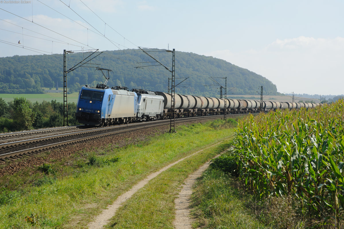 185 587-3 der HGK ist am Morgen des 10. Mai 2017 mit einen Kesselwagen-Ganzzug auf der KBS 920 bei Herrnberchtheim auf den Weg nach Süden. Ulrich Slovig