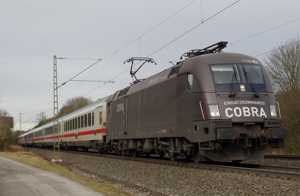 Eine ICE2-Doppeleinheit ist auf dem Weg nach München zwischen Gollhofen und Uffenheim unterwegs und passiert eine der vielen Kurven auf der Strecke (08.02.2014) Sebastian B.