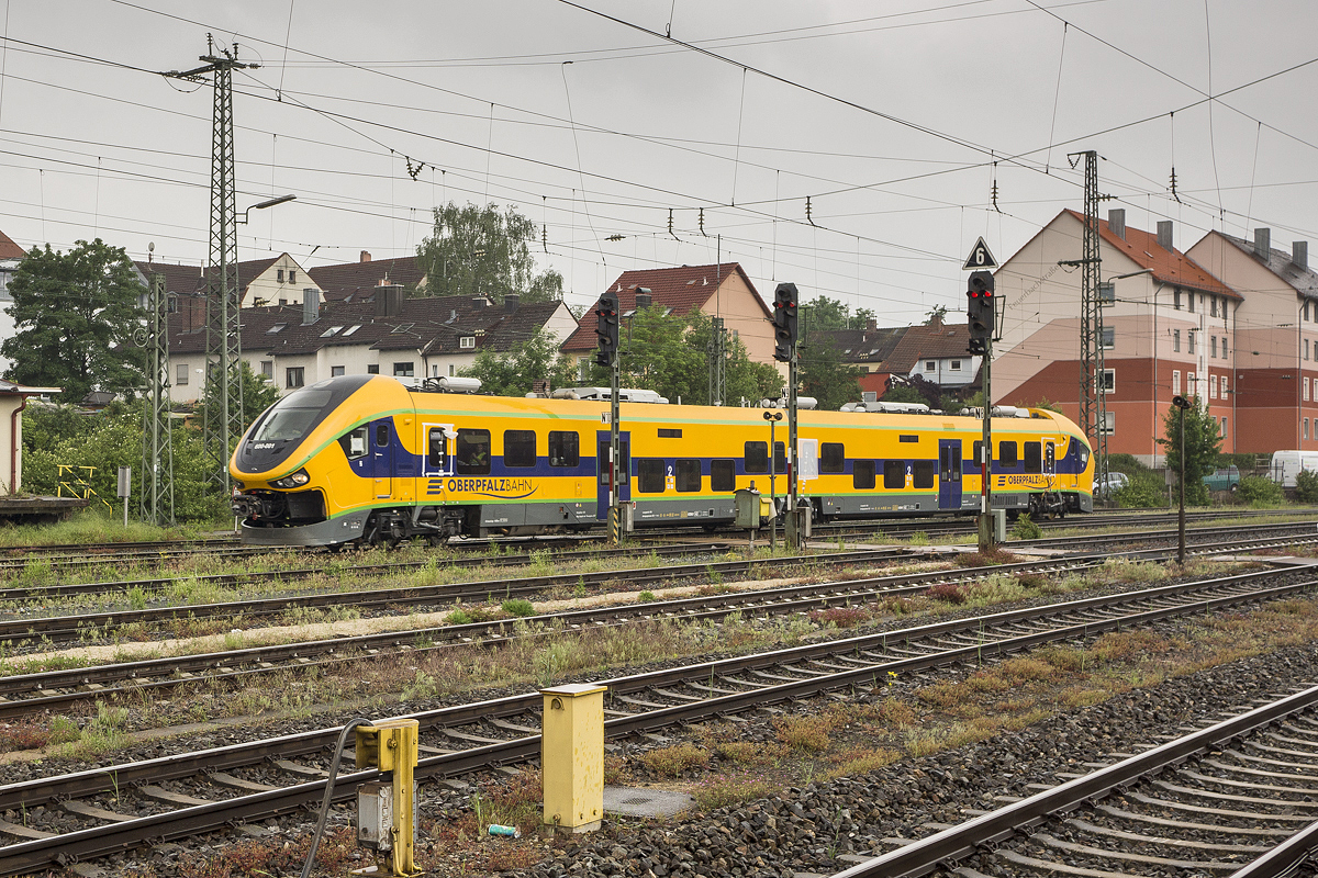 Pesa Link VT 600 001 der Oberpfalzbahn auf Test- und Messfahrt auf der KBS 920 bei der Durchfahrt durch den Bahnhof Ansbach am 29.05.2014. Ingo Konrad Müller