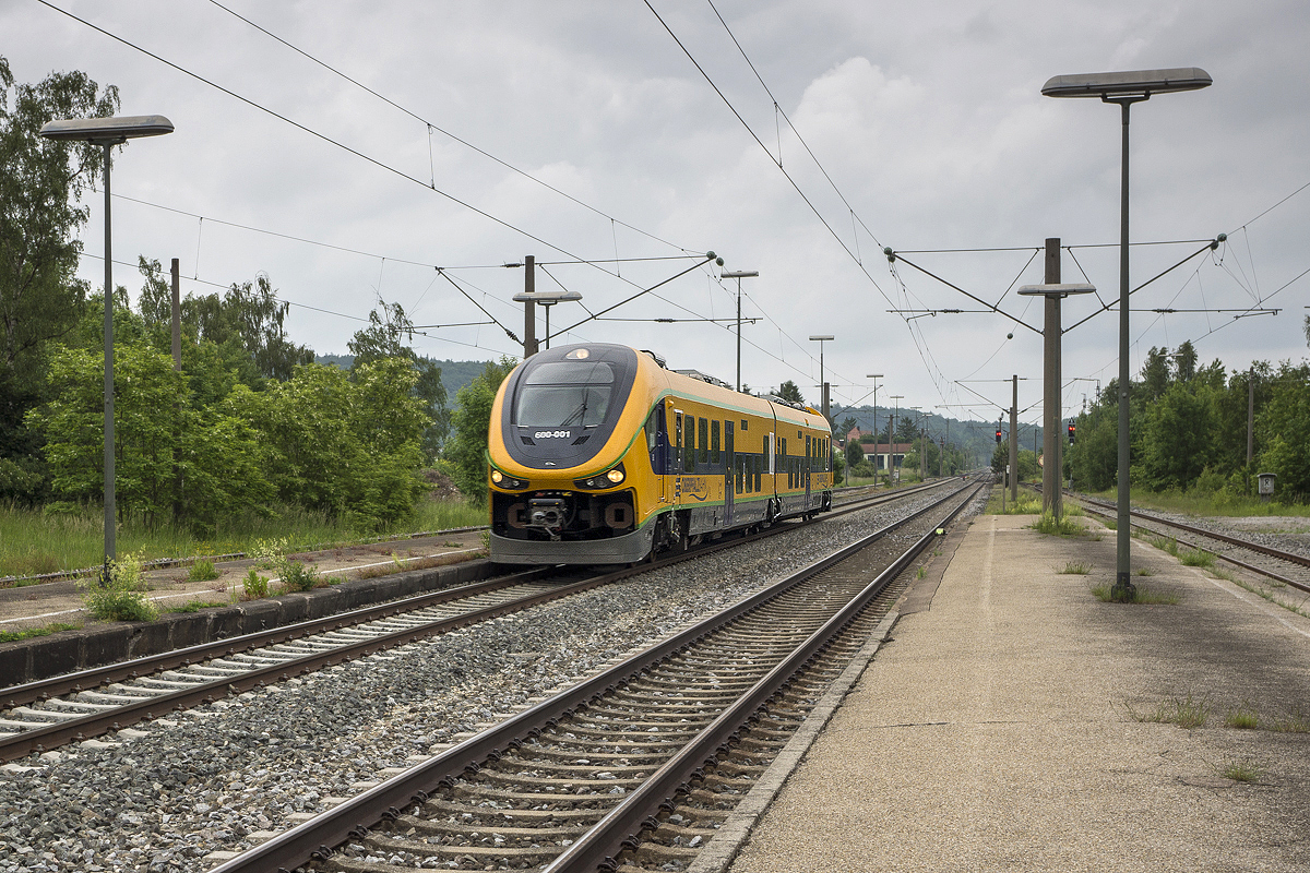 Pesa Link VT 600 001 der Oberpfalzbahn auf Test- u. Messfahrt auf der KBS 920 bei der Durchfahrt durch den Bahnhof Dombühl am 29.05.2014. Ingo Konrad Müller