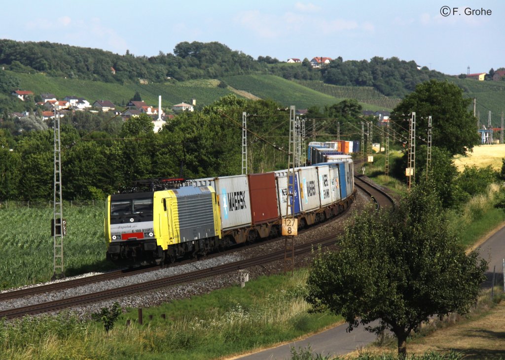 Dispolok ES 64 F4-016 (E 189 916RT) vor Containerzug Richtung Würzburg, KBS 920 Würzburg - Treuchtlingen, fotografiert zwischen Winterhausen und Heidlingsfeld am 05.07.2010 Frank Grohe