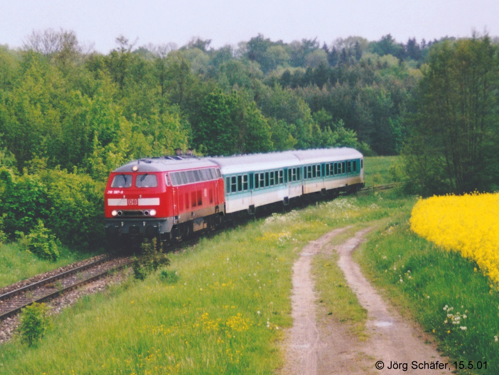 Eine RB nach Rothenburg am 15.5.01 bei Strecken-km 2 westlich der Autobahnbrücke. Obwohl der Ort Endsee (links vom Bild) nur einen Kilometer entfernt ist, lag der bis 1975 bediente Haltepunkt erst in Strecken-km 3,3. Die Monatskarte zum wichtigsten Ziel Rothenburg war dadurch billiger... Jörg Schäfer
