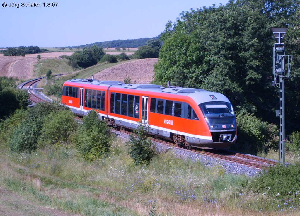 Blick nach Südwesten auf den aus Rothenburg kommenden 642 069. Am 17.9.02 fehlen nur noch 500 Meter, bis er in Steinach wieder einmal am Bahnsteig wenden kann. Jörg Schäfer