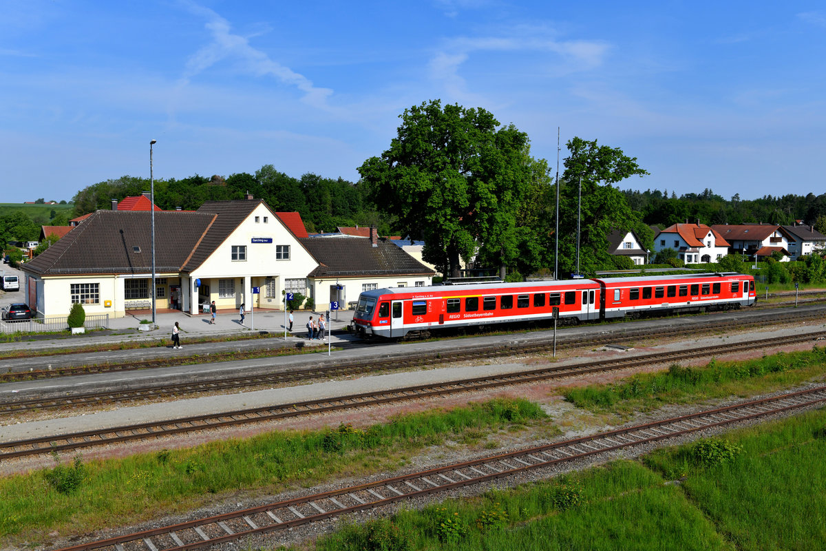 Der in der Ursprungslackierung gehaltene 628 486 / 673 legt einen kurzen Halt im Bahnhof Garching / Alz ein. In wenigen Augenblicken wird er seine Fahrt als RB 27090 in Richtung Mühldorf fortsetzen. Seit 25 Jahren verrichten diese Triebzüge nun schon zuverlässig ihren Dienst auf den nicht-elektrifizierten Nebenbahnen im südlichen Oberbayern (25. Mai 2019). Christoph Schneider