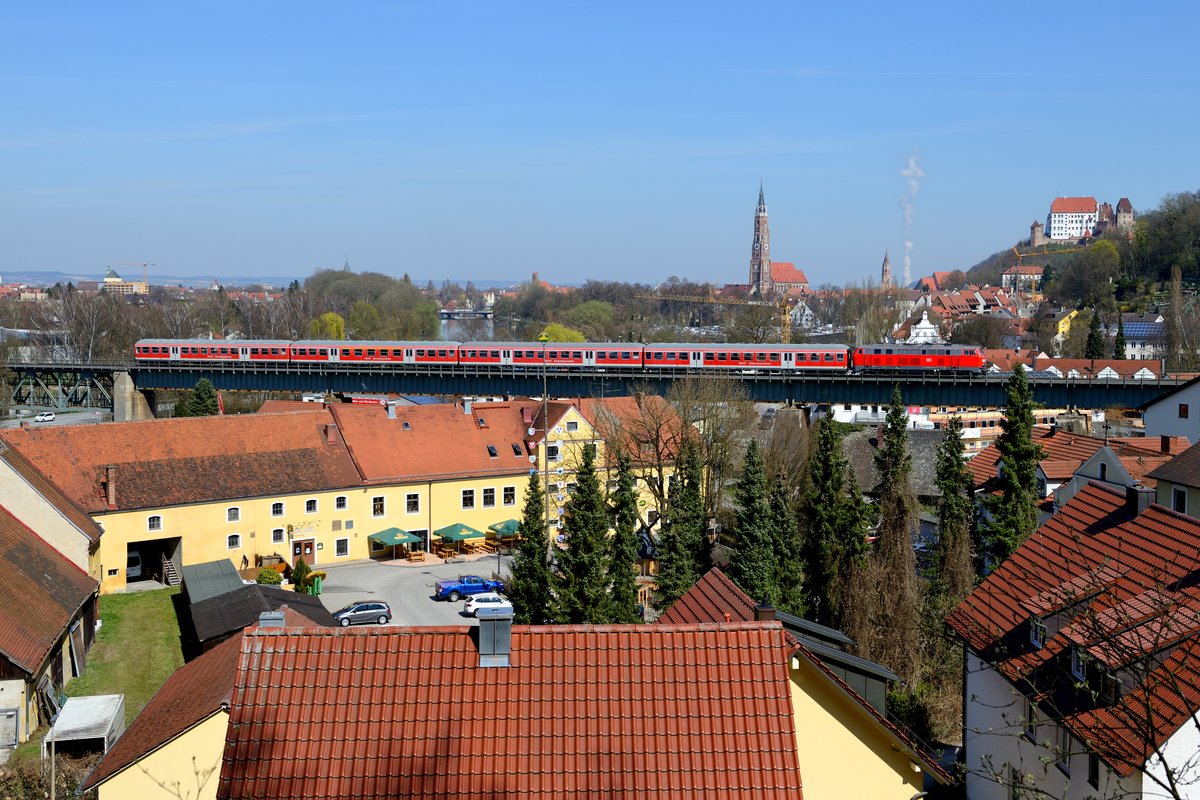Über den Dächern von Landshut - oder: Die letzten n-Wagen Bayerns. Aktuell gibt es nur noch eine planmäßige Leistung, die südlich der Donau mit einem aus ehemaligen Silberlingen gebildeten Zug gefahren wird. Es ist dies der sogenannte Schülerzug zwischen Mühldorf und Landshut. Am 31. März 2017 besuchte ich die niederbayerische Landeshauptstadt und konnte dabei die RB 27145 nach Mühldorf, geführt von 218 404, aufnehmen. Am südlichen Stadtrand ergibt sich folgendes Motiv, bei dem man viele Sehenswürdigkeiten Landshuts im Blick hat. Am markantesten sind natürlich der 130 Meter hohe Turm der Stiftsbasilika St. Martin und die Burg Trausnitz. Bei genauerer Betrachtung kann man noch die Jodokskirche entdecken, sowie die Heilig-Geist-Kirche in der Nähe der links im Bild fließenden Isar. Neuerer Bauzeit entstammt das Kernkraftwerk Isar, bei dem die Dampfwolke von dessen Betrieb kündet. 2022 soll es vom Netz gehen. Beim gelben Gebäude im Vordergrund handelt es sich um das alte Zollhaus. Mit dem Einsatz der n-Wagen kann es übrigens kurzfristig vorbei sein, sobald in Mühldorf genug Doppelstockwagen zur Verfügung stehen, wird ein Wendezug die Leistung übernehmen. Christoph Schneider