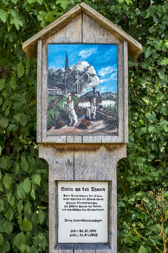 Dieses Marterl in St. Georgen bei Traunreut erinnert an einen tödlichen Unfall, der durch die Eisenbahn ausgelöst wurde. Bei der Vorbeifahrt eines Zuges auf der Bahnlinie Mühldorf - Traunstein, deren Trasse hier parallel Zur Landstraße Traunreut - Trostberg verläuft, scheuten 1916 die Pferde eines Bierfuhrwerkes. Die schweren Fässer verrutschten und erdrückten den Fuhrmann. 20.07.2013 Ingo Konrad Müller