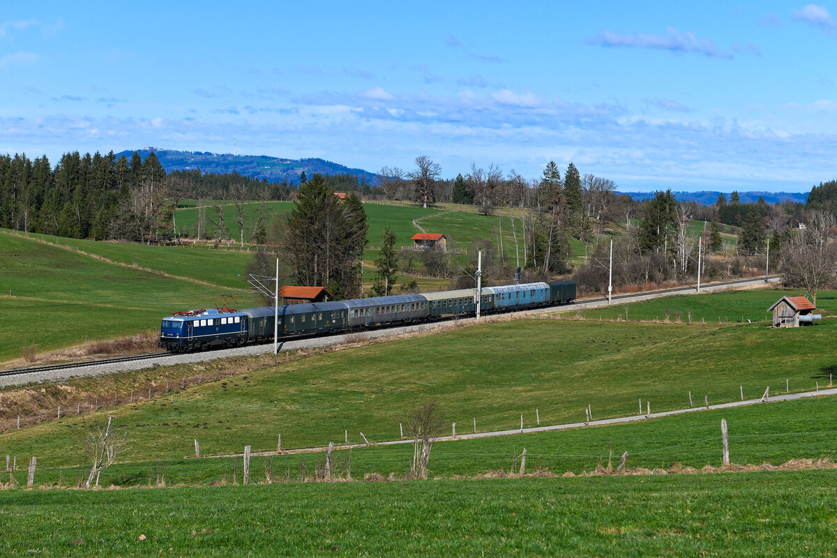 Am 24. Februar 2024 fuhr der DBK Historische Bahn e.V. einen Ski - Express von Schorndorf nach Garmisch - Partenkirchen. Der unter der Nummer DBK 29385 verkehrende Sonderzug wurde aus der E 10 228 und Wagenmaterial aus den 1960-er Jahren gebildet, unter anderem zwei Bahnpostwagen, einem Silberling und einem Bm 238. Die blaue Kastenzehner - eine Dauerleihgabe des DB Museums Nürnberg an den Verein - befindet sich in einem perfekten Erhaltungszustand. Bei Uffing am Staffelsee erwartete ich den historischen Sonderzug, der mit etwa 30 Minuten Verspätung unterwegs war. Im Hintergrund der Hohe Peißenberg, neben dem Rundfunkturm sind auch die Wallfahrtskirche und das meteorologische Observatorium zu erkennen.