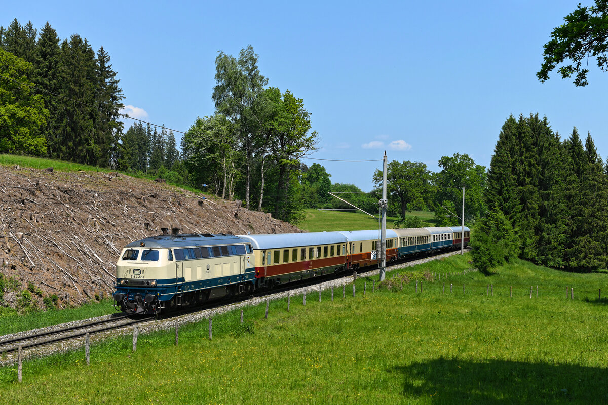 In Weilheim machte die als FD 523  Allgäu  deklarierte Sonderfahrt Kopf und fuhr nach einem Aufenthalt weiter in Richtung Garmisch. Auf der Mittenwaldbahn konnte ich die stilechte Epoche IV Garnitur, geführt von der ozeanblau-beigen 218 446, zwischen Huglfing und Uffing erneut fotografieren. Auch früher verkehrte hier die Baureihe 218 planmäßig unter Fahrdraht und wurde vor Reisezügen von und nach Augsburg eingesetzt.
