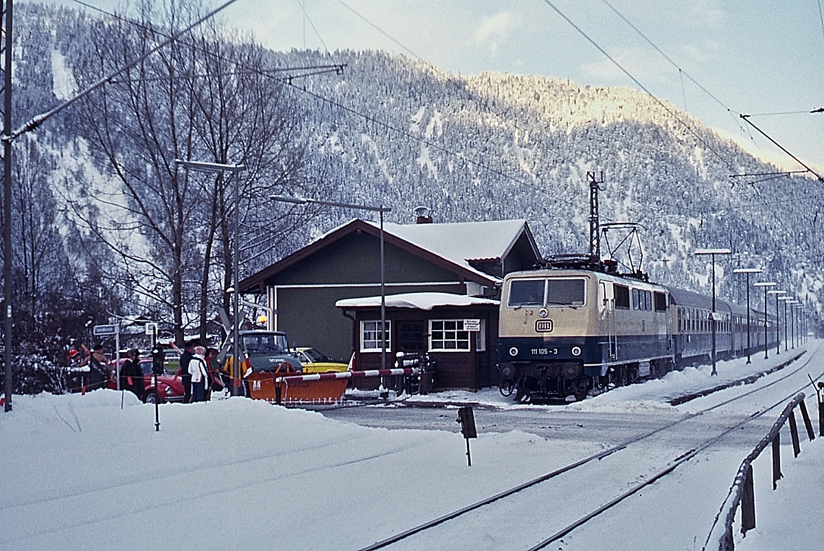 Vor allem im Winterhalbjahr ist es wegen des Sonnenstandes nicht ganz einfach, zwischen Garmisch-Partenkirchen und Farchant in Richtung Norden fahrende Züge mit dem Zugspitzmassiv im Hintergrund zu fotografieren. Auch an diesem Dezembervormittag 1979 war die Sonne schon so weit fortgeschritten, dass bei dieser Aufnahme einer unbekannten 111 vor einem Eilzug nach München  die Lokfront schon im Schatten lag. Schnee lag zu diesem Zeitpunkt nur auf den Gipfeln, das sollte sich aber zu Sylvester ändern. Den genauen Fotostandpunkt kann ich leider wegen der inzwischen fortgeschrittenen Bebauung nicht mehr identifizieren.
