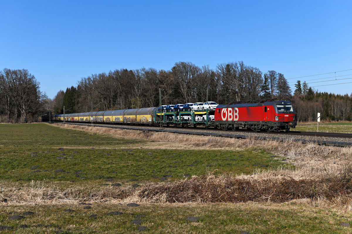 Produkte aus dem Hause Volkswagen wurden am 01. März 2022 mit dem Autotransportzug DGS 49831 von München Milbertshofen nach Verona Q.E. befördert. Zuglok über den gesamten Laufweg hinweg war die 1293.041 der ÖBB. Bei Brannenburg im Inntal konnte ich die Leistung dokumentieren.