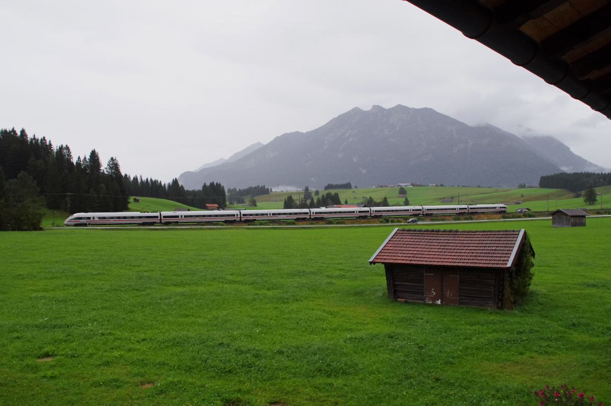 Dauerregen - Der Sommer war am 17.09.2016 vorbei. Im Dauerregen ist ICE 1206 von Mittenwald nach Berlin unterwegs. Abfahrt war um 10.54 Uhr in Mittenwald und um 11.01 Uhr rollt der Hochgeschwindigkeitszug mit 60 Km/h die Schmalenseehöhe in Richtung Klais hinab. Bahnstrecke 5504 München - Mittenwald (Grenze) Ivonne Pitzius