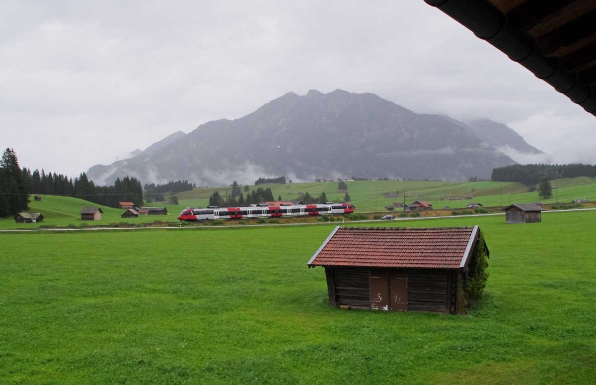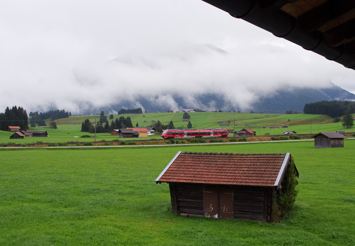 Die Schlechtwetterbilder mal zuerst! An unserem Abreisetag kam die Sonne leider nicht mehr zum Vorschein. Ein Werdenfels Minihamster ist aus München nach Mittenwald unterwegs. Durch das schlechte Wetter lässt für den Almabtrieb in Mittenwald wohl kein großer Besucheransturm erwarten. Am Wochenende fahren Verstärkerzüge am Morgen aus München in Richtung Karwendelgebirge. Für den "Frühzug" reicht an diesem Tag wohl ein Minihamster aus. Eine Stunde später wird eine 111er mehr Gäste in die Region befördern. Blick aus unserem (Schlaf-) Zimmerfenster am 18.09.2016 Ivonne Pitzius