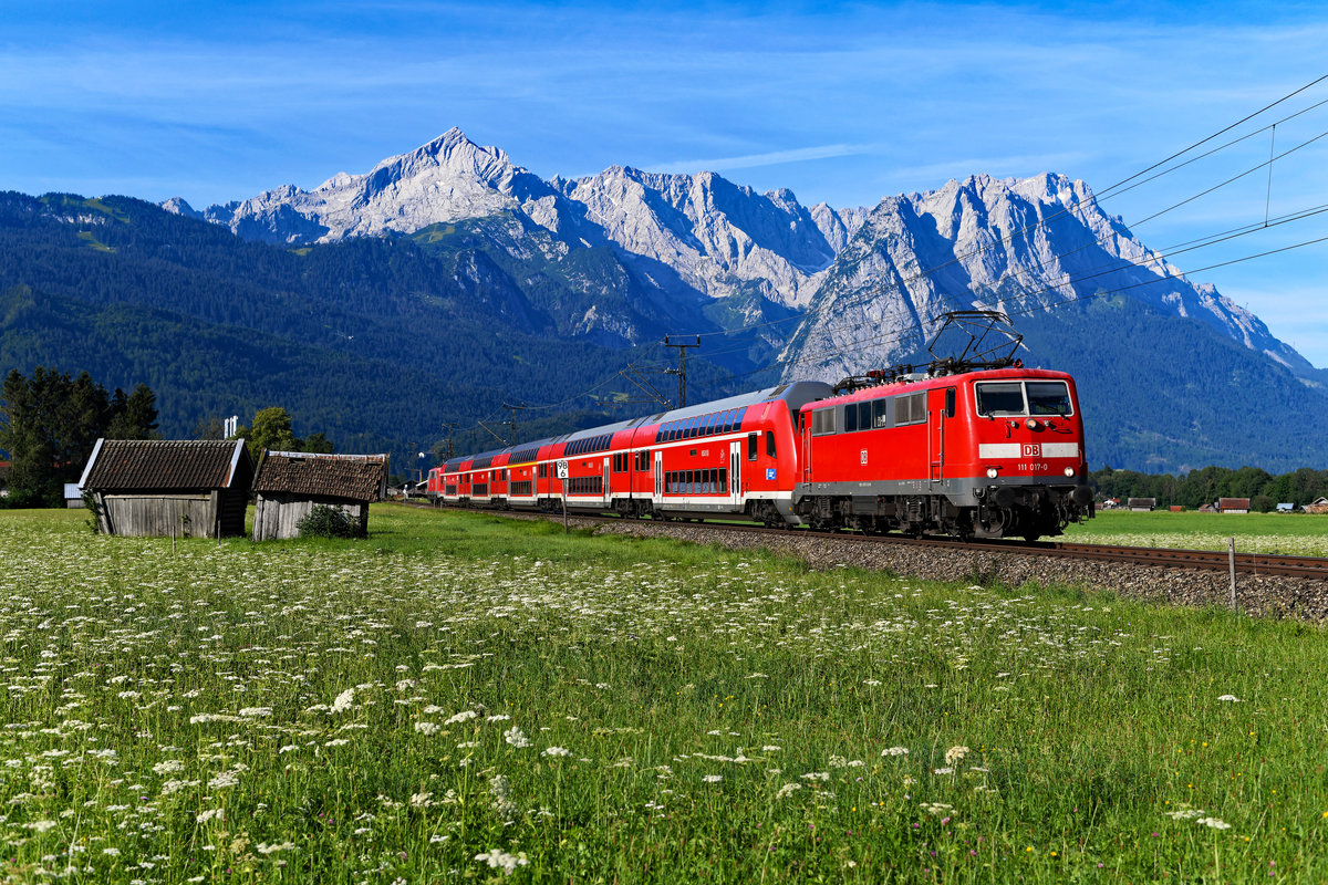 Nach dem Fehlschlag einige Tage zuvor, nahm ich am 13. Juli 2020 einen neuen Anlauf, um die RB 59456 nach München HBF bei Garmisch-Partenkirchen zu fotografieren. Diesmal hat es (fast) wunschgemäß geklappt. Glück hatte ich mit der Bespannung, mit 111 017 führte die aktuell älteste Lok der Baureihe, die im Bh München stationiert ist. Pflegezustand und der Scherenstromabnehmer fielen auch positiv ins Gewicht. Der Blick auf Alpspitze und Zugspitze war klar, die Wiese mit den blühenden Schafgarben war auch noch nicht abgeerntet. Allerdings konnte man feststellen, dass nach dem Lockdown der Flugverkehr wieder aufgenommen wurde, zahlreiche sich auflösende Kondensstreifen zeigten sich bereits zu früher Stunde am Himmel.