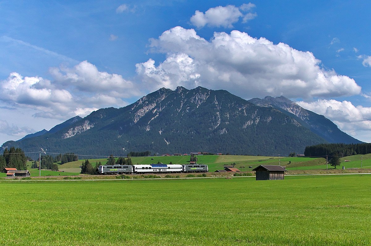 Nach zwei Stunden Aufenthalt in Mittenwald fährt der LUXON Panoramawagen mit RailAdventure 111 210 + 111 222 wieder zurück nach München.