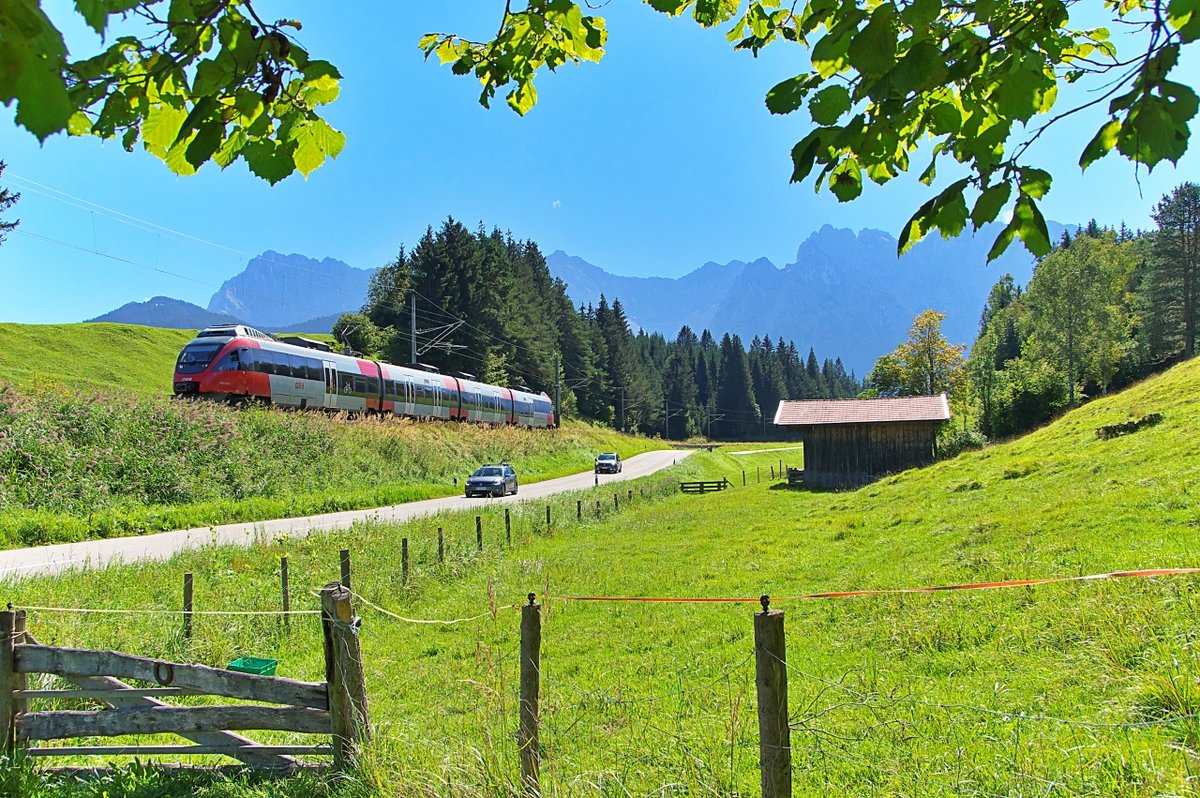 Am 06.09.2020 war ÖBB 4024 090-5 als REX Innsbruck - Garmisch-Partenkirchen unterwegs. Auf einer Höhe von 960 Metern hat der Triebwagen gerade die Schmalenseehöhe passiert und rollt nun hinab nach Klais. Mittenwaldbahn / Bahnstrecke 5504