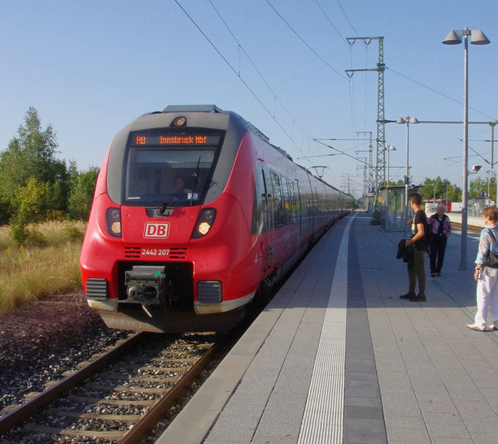 Am Abend des 13.09.2016 warteten wir auf unseren Anschluß nach Klais. Wir hatten einen Ausflug nach Oberammergau gemacht. Der vordere Hamster fährt bis Innsbruck (2442 207) und der hintere wird in Garmisch-Partenkirchen abgekuppelt, um weiter nach Reutte in Tirol zu fahren. Bahnstrecke 5504 München - Mittenwald Grenze im Bahnhof Murnau am Staffelsee. Erhard Pitzius