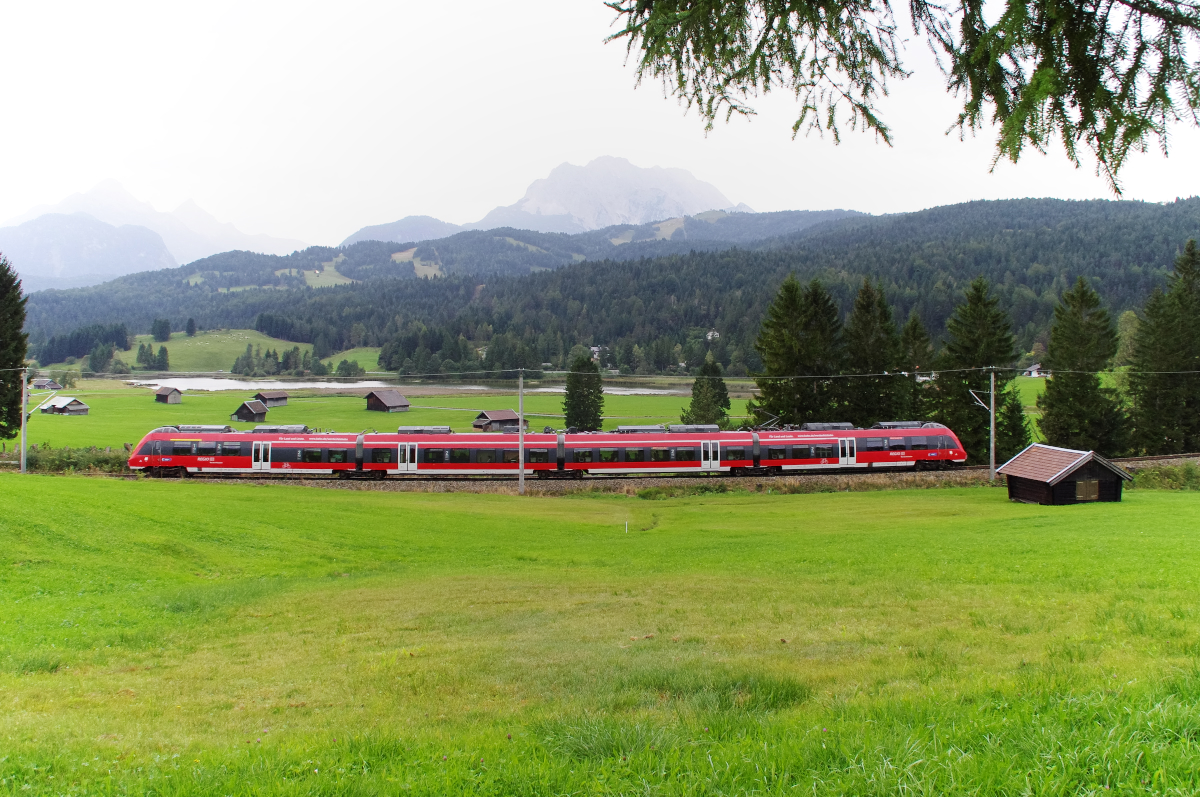 Am Schmalensee mit Blick auf die Zugspitze - Ein Hamsterbäckchen der DB Regio Werdenfelsbahn ist als RB München - Mittenwald unterwegs und umrundet den Schmalensee. Bis Mittenwald sind es nur noch wenige Kilometer und es geht nur noch bergab. Bahnstrecke 5504 München - Mittenwald Grenze am 15.09.2016 Ivonne Pitzius