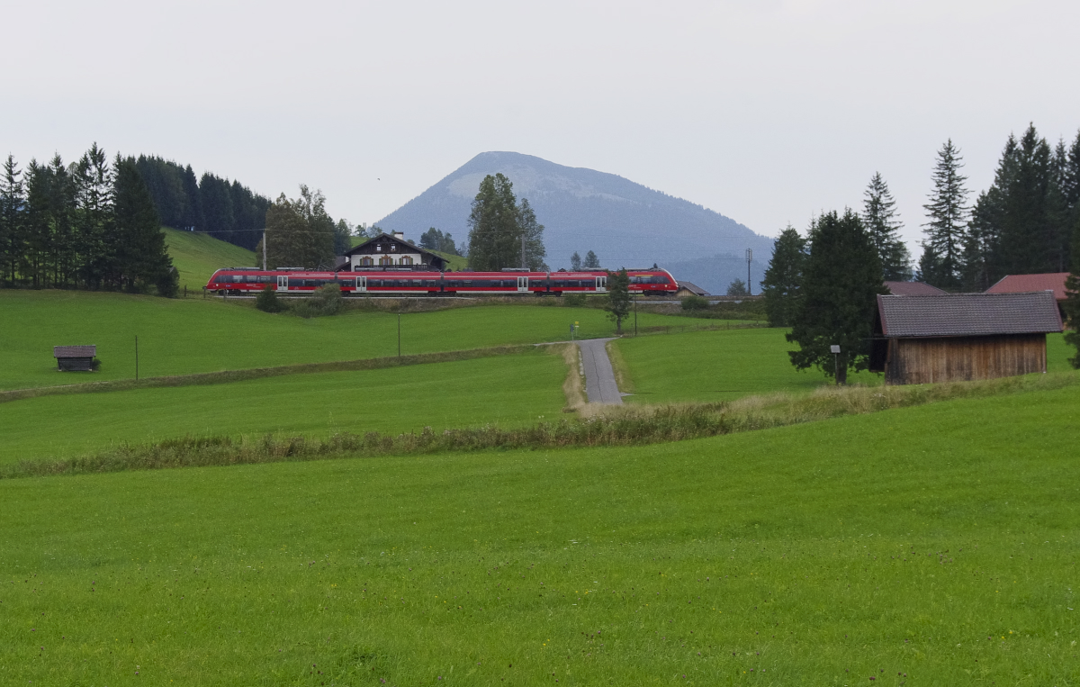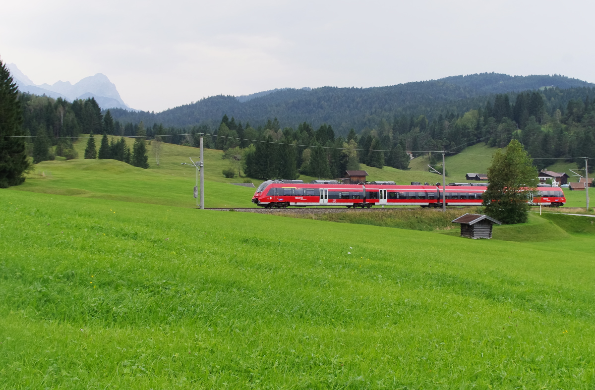 Schön ist, wenn man trotz Regenwetter einen trockenen Standort mit Blick auf die Bahn hat. Ein ÖBB Talent fährt an unserer Ferienwohnung vorbei, Innsbruck - Garmisch-Partenkirchen, so lautet die Relation. Bahnstrecke 5504 München - Mittenwald kurz vor Klais. 17.09.2016 Erhard Pitzius