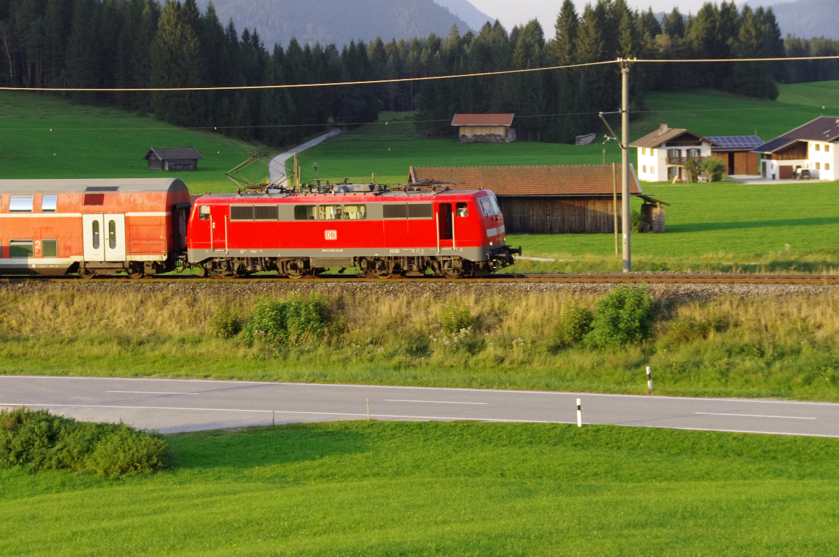 Der Zug muss um das Außerfern herumfahren, am Wettersteingebirge vorbei,um dann durch das Karwendelgebiet und die Tiroler Alpen in das Tal des Inn zu gelangen. Interessant ist die Doppeltraktion und die Spekulation, aus wie vielen Wagen der Zug bestehen wird. Bahnstrecke 5504 München - Mittenwald Grenze mit ÖBB 1016 002 und 2016 041 kurz vor der Schmalenseehöhe. 12.09.2016 Erhard Pitzius