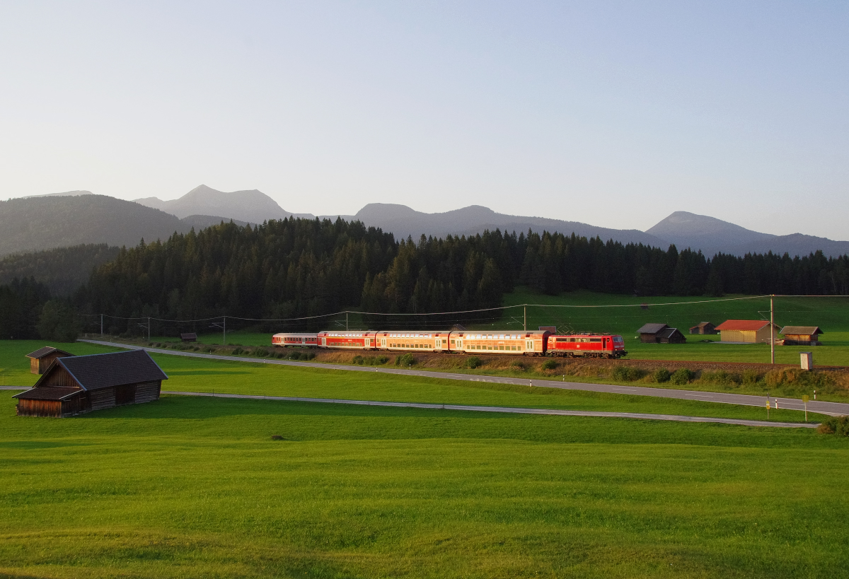Kurz vor Sonnenuntergang fährt die RB Mittenwald - München die Schmalenseehöhe in Richtung Klais hinab. Bahnstrecke 5504 München - Mittenwald Grenze beim Landhaus Wackerl - 15.09.2016 Ivonne Pitzius