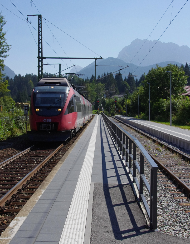 ÖBB 4024 072 hat Einfahrt aus Mittenwald kommend in den Bahnhof Klais. Bis zur Endstation Garmisch-Partenkirchen geht es nur noch bergab. Der Bahnhof Klais wurde im Vorfeld des G7 Gipfels auf Schloß Elmau im Jahr 2015 aufgehübscht! 13.09.2016 Bahnstrecke 5504 München - Mittenwald Grenze Erhard Pitzius