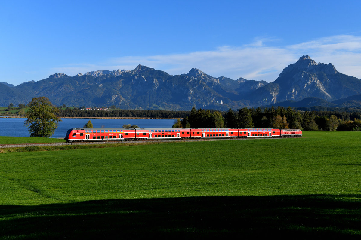 Bei Reinertshof ergibt sich dieser schöne Blick über den Foggensee auf die Ammergauer Alpen. Rechts sieht man den Säuling, mittig den Branderschrofen, links den Strausberg und den Tegelberg. Auch das Schloss Neuschwanstein ist gut erkennbar. Am 14. Oktober 2018 konnte ich hier den RE 57517 auf seiner Fahrt nach München HBF fotografieren, es schob die 218 446. Christoph Schneider