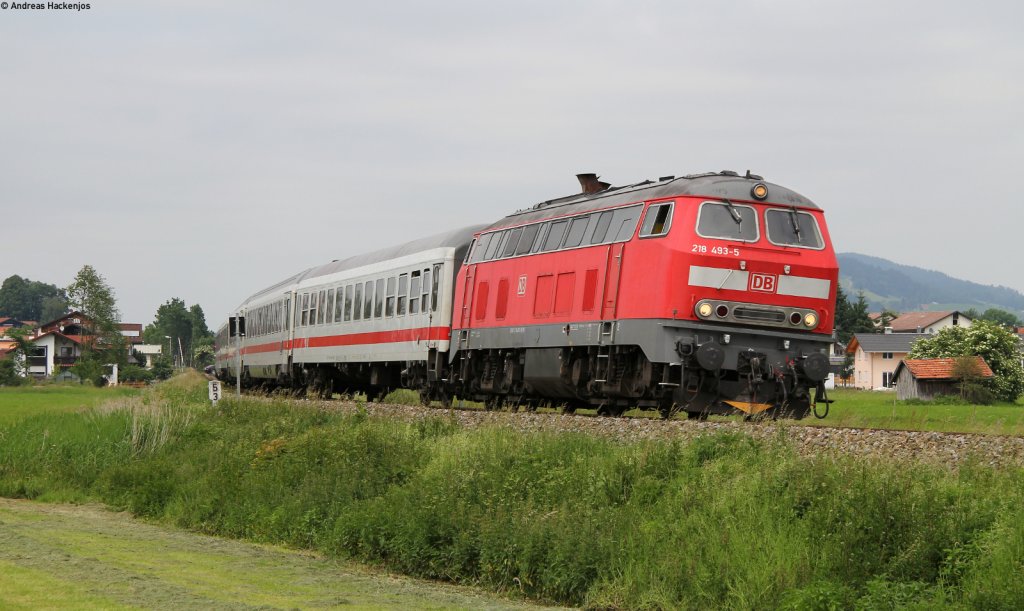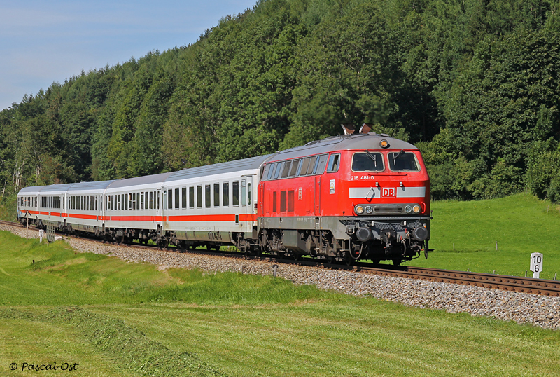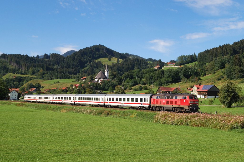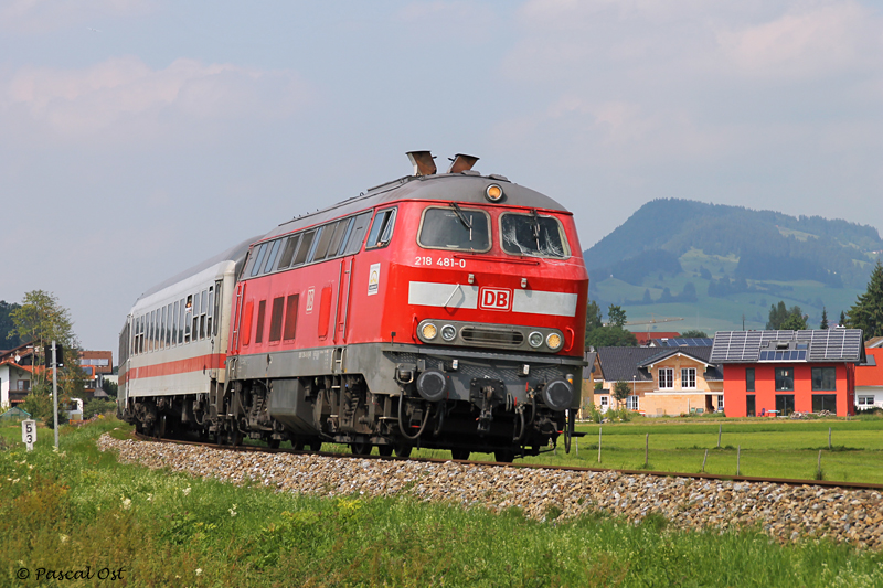 Mit ihrem IC 2085 wird 218 494-3 am 12. August 2012 gleich Oberstdorf erreichen. Hinter der Lok läuft ein ehemaliger Interregio-Wagen, der sich für ein Sounderlebnis anbietet. ;-) Pascal Ost